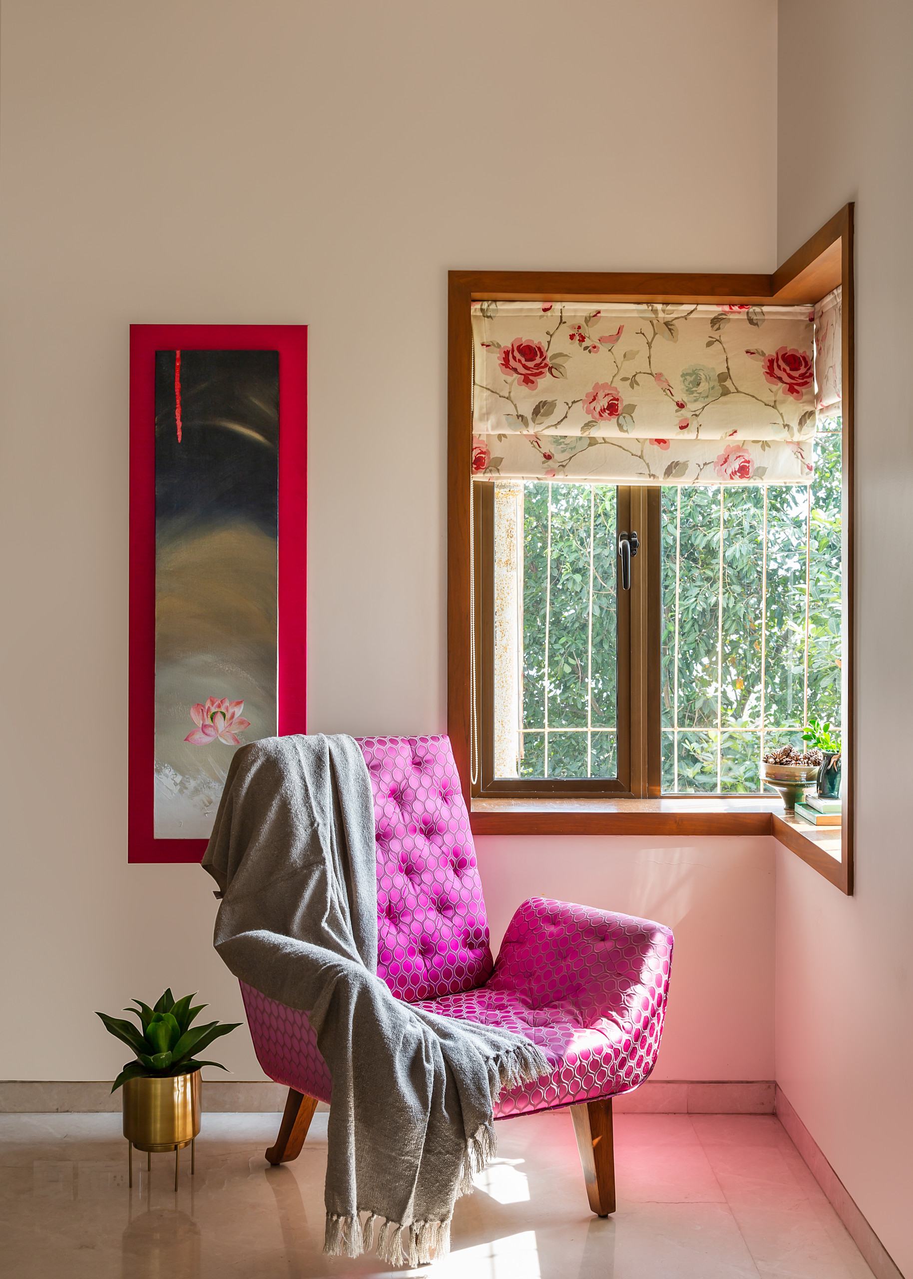 Opposite the workstation, sequestered from the rest of the room, is a knock-back nook, defined by a fuchsia brocade-upholstered chair and rose-printed blinds that add pops of floral cheer to the solid aesthetic.