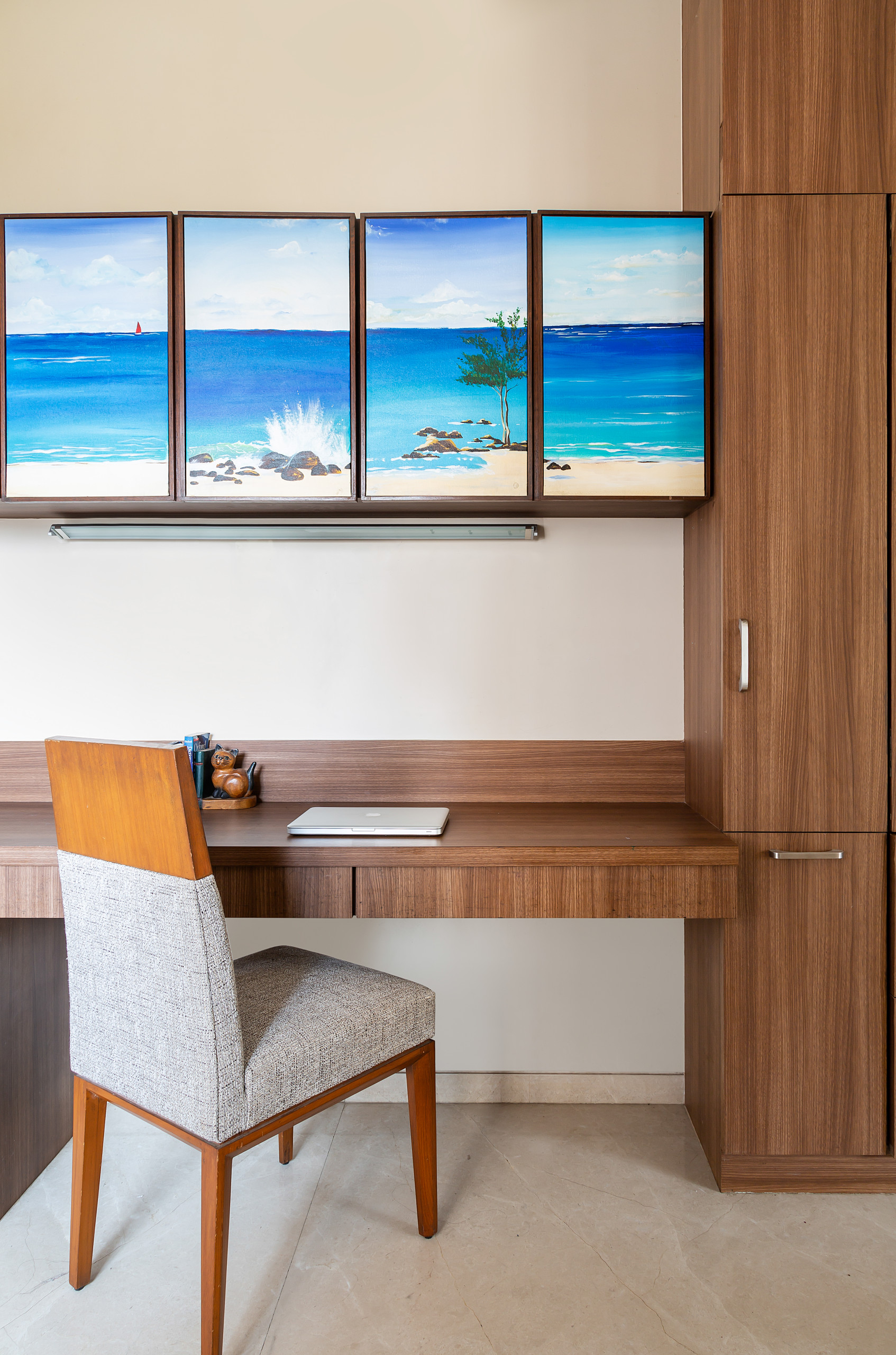 A lateral passage branches to the right, hosting a wide wooden workstation flanked by a column of cupboards. Above the desk, a row of storage units, emblazoned with beachside images nod to the outdoors.