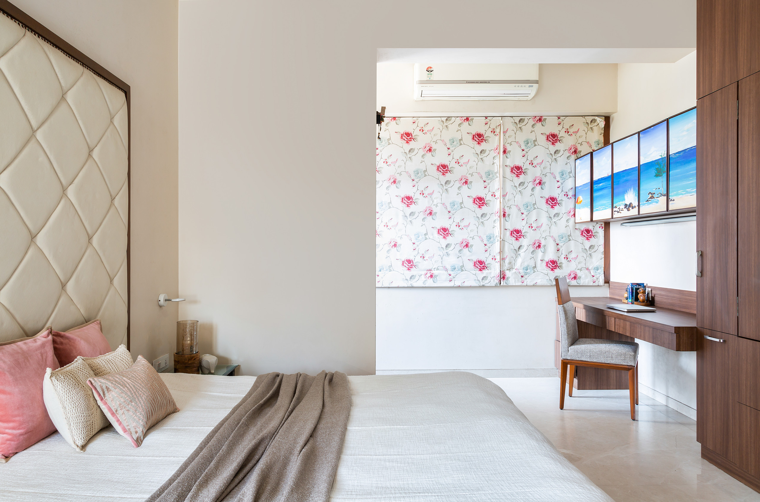 “This bedroom had to incorporate both the mother’s and the daughter’s preferences. The mother is an artist herself and many of her works are showcased here,” says Thakker.