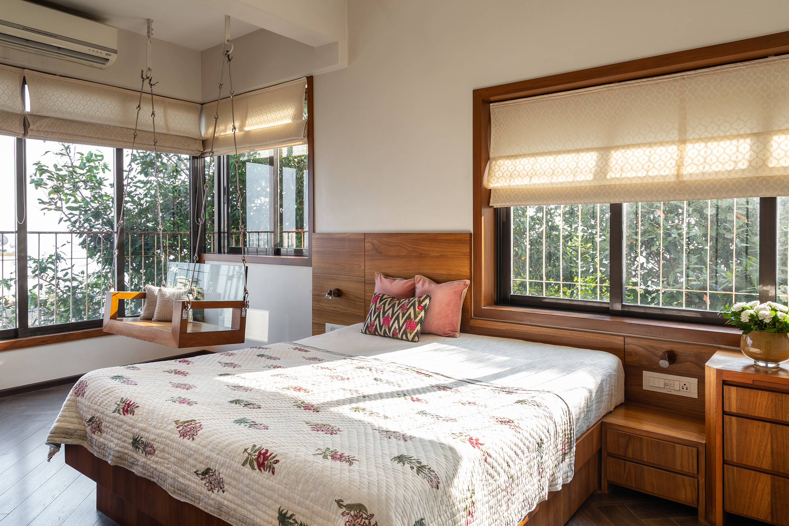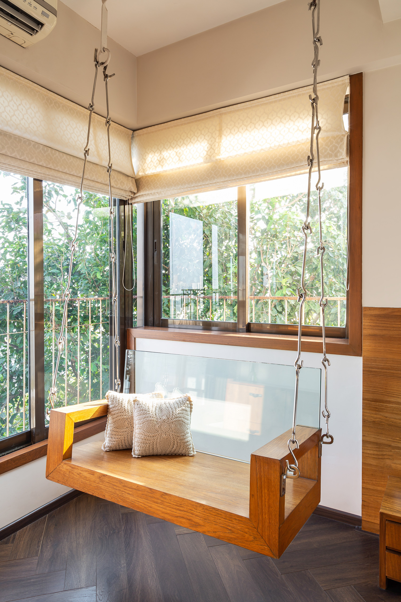The master bedroom is situated opposite the dining area. Inside, a sweeping L-shaped window defines an enclosed balcony, where a glass-backed swing takes pride of place. The bed is positioned between a wall and a window. Behind it, wall panels, serving as a half-headboard, skirt the shape of the window.