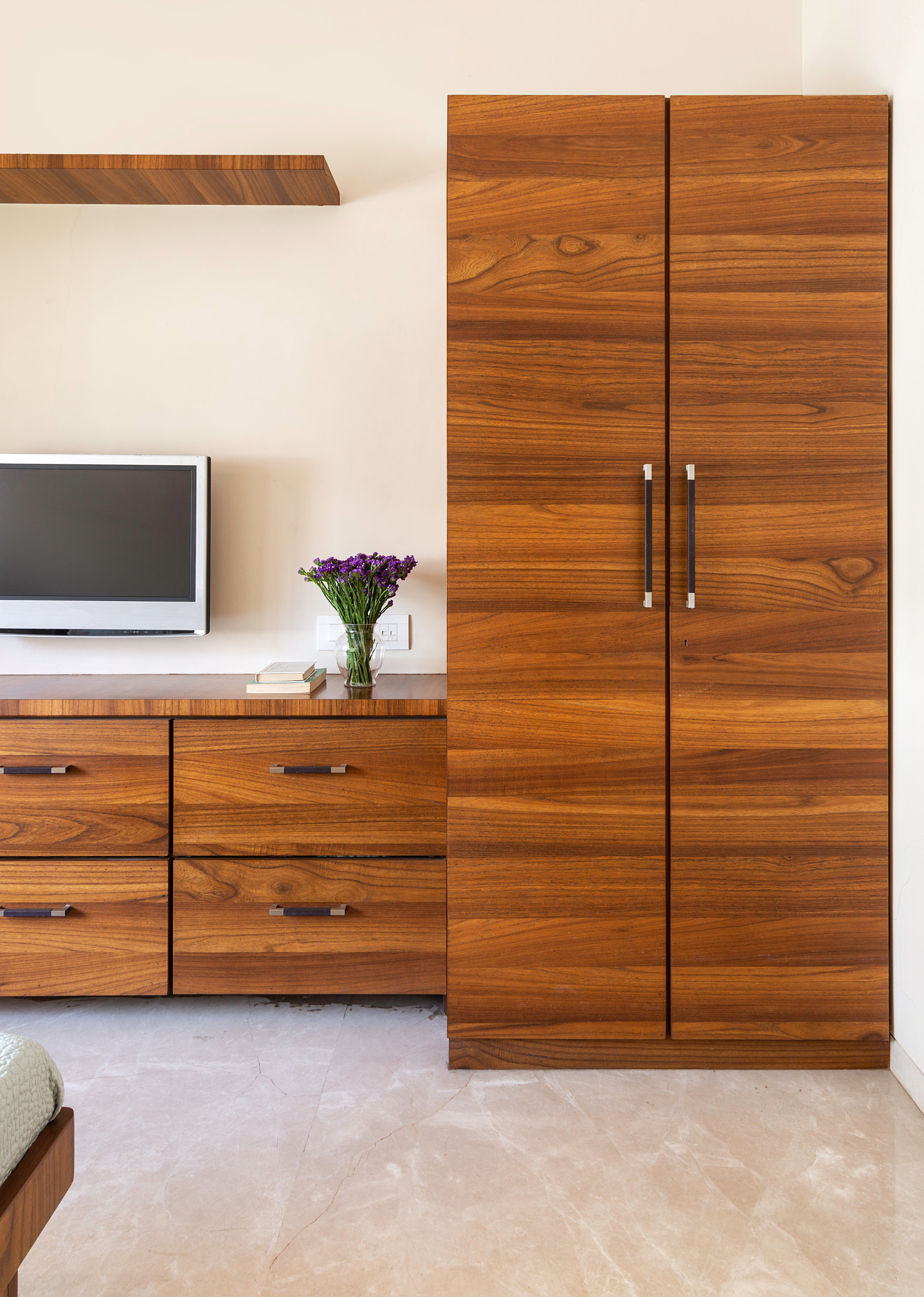 Wood-finish wardrobes characterise the wall opposite the bed. An alcove, underpinned by drawers, hosting a bijou television unit, features in the centre of the wardrobe scheme.