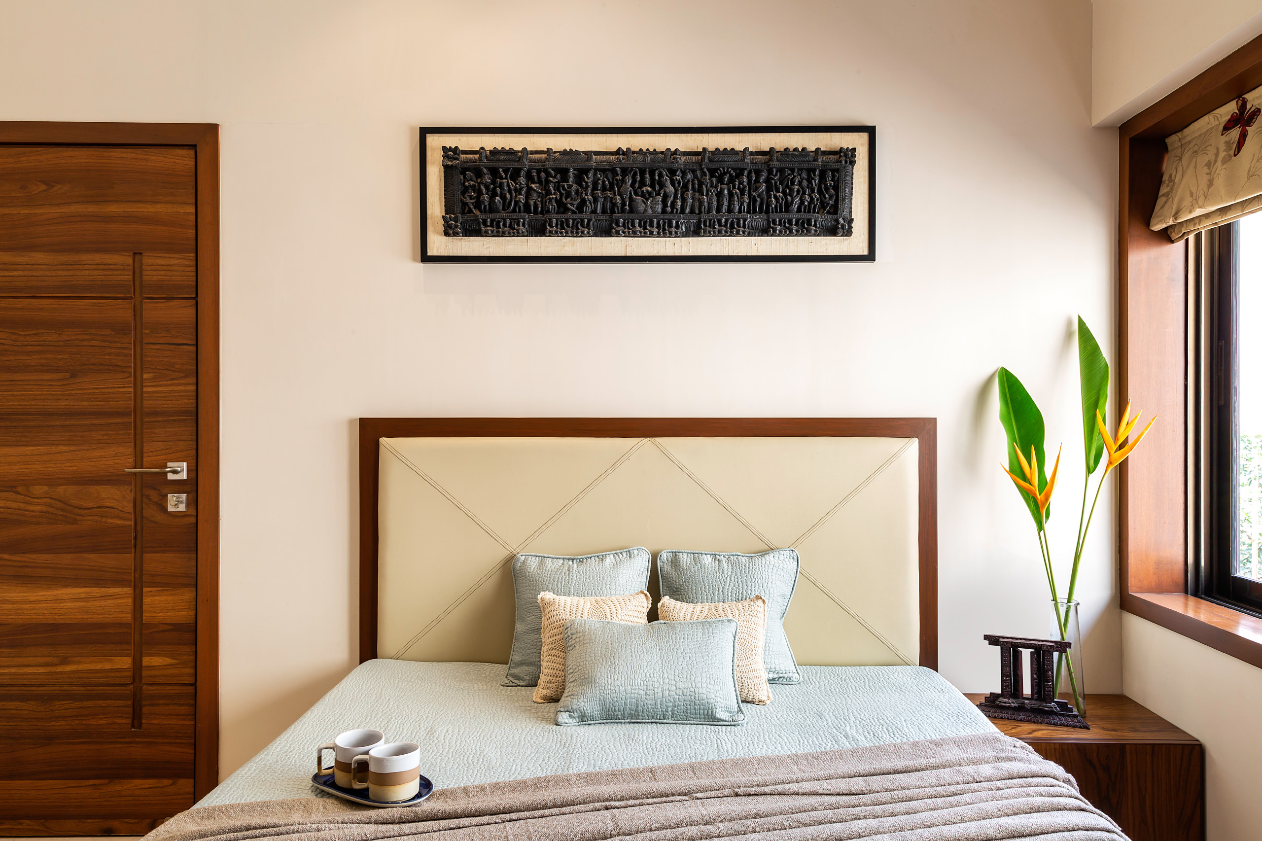The guest bedroom is steeped in vanilla tones. A cream leatherette headboard zones the slumber area. Above the bed a wooden carving mounted on raw silk lends the room character.
