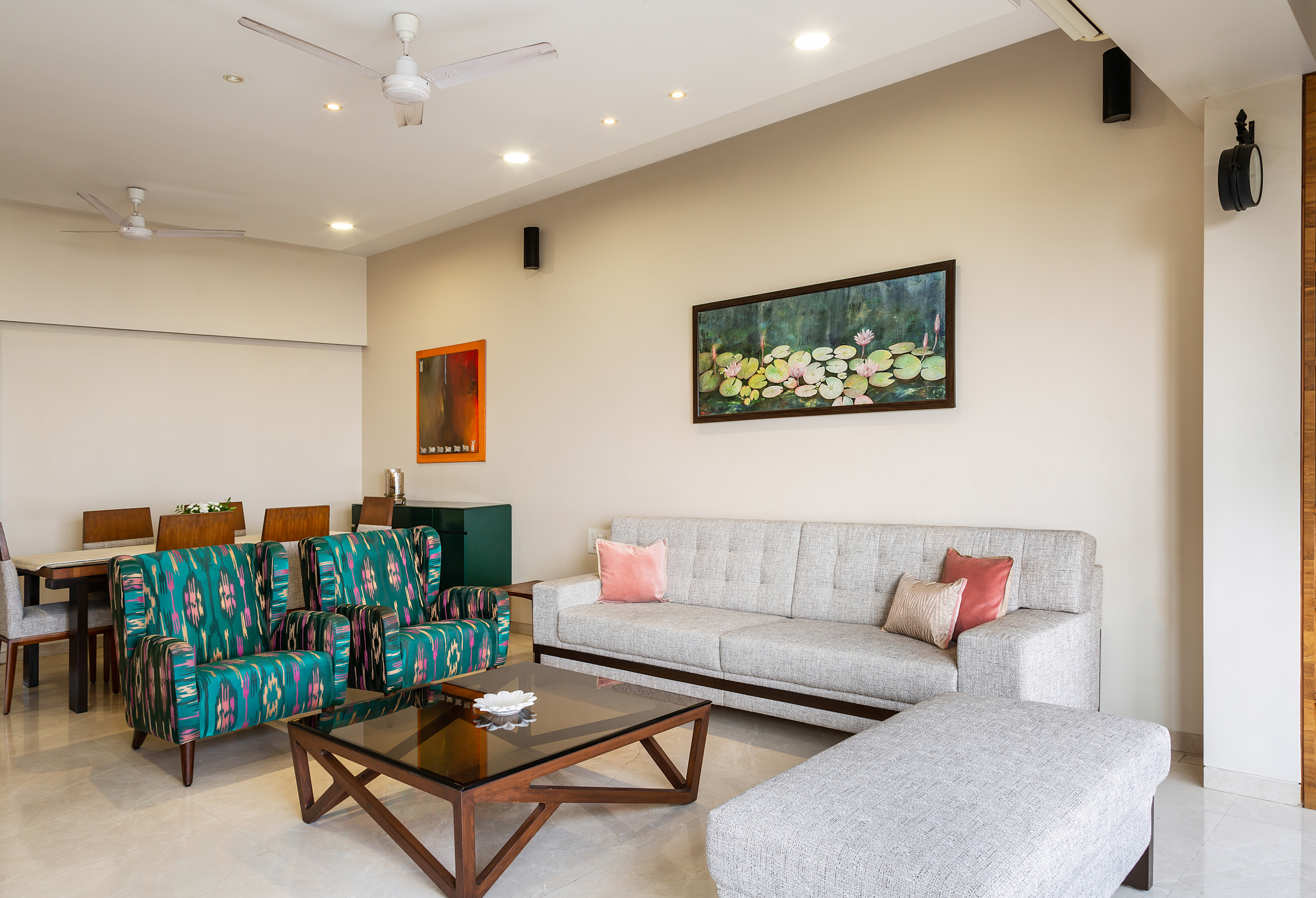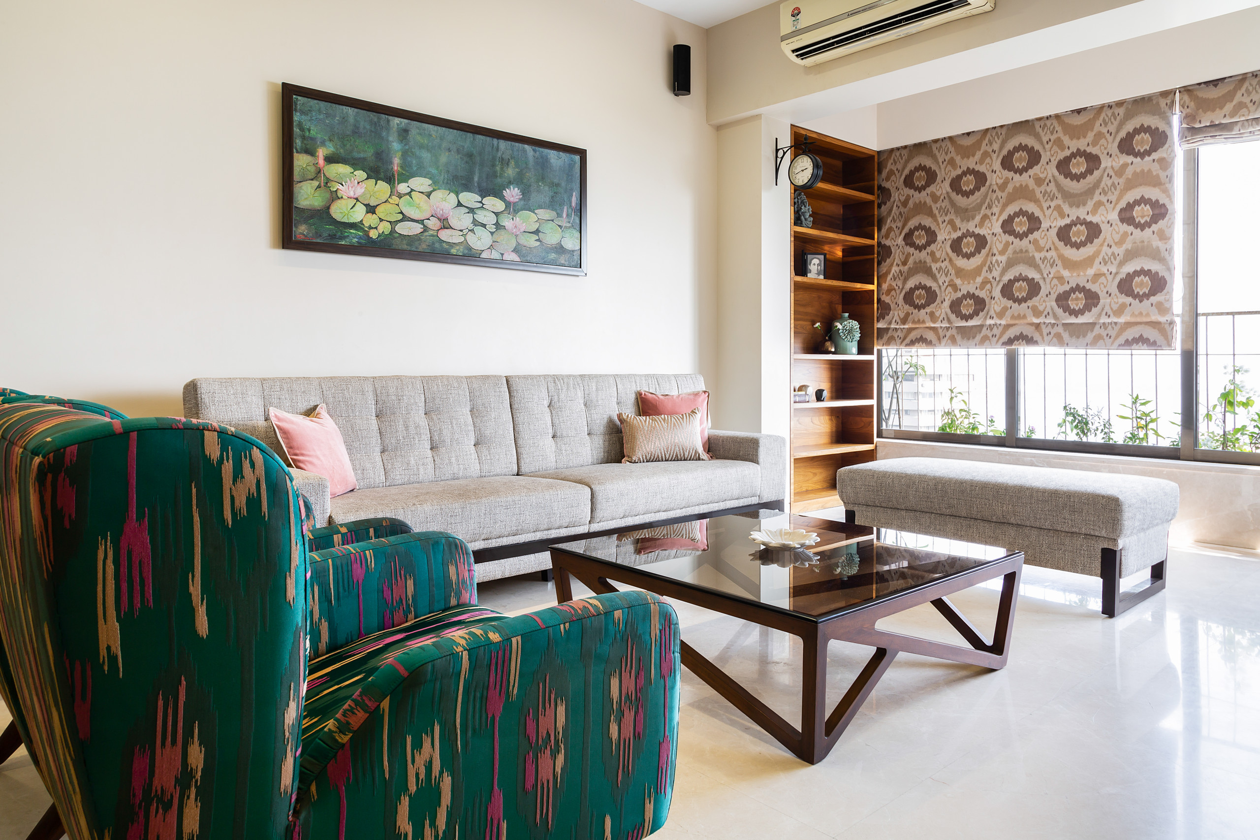 To the left of the foyer, the living room presents a pleasant, elegant ambience, awash in natural light. Here, a seating layout, composed of a cushioned sectional and two bottle-green ikat-printed lounge chairs, takes centre stage. A teak-wood coffee table lies at the centre of the arrangement, while trad brocade blinds perpetuate the ethnic upholstery scheme.