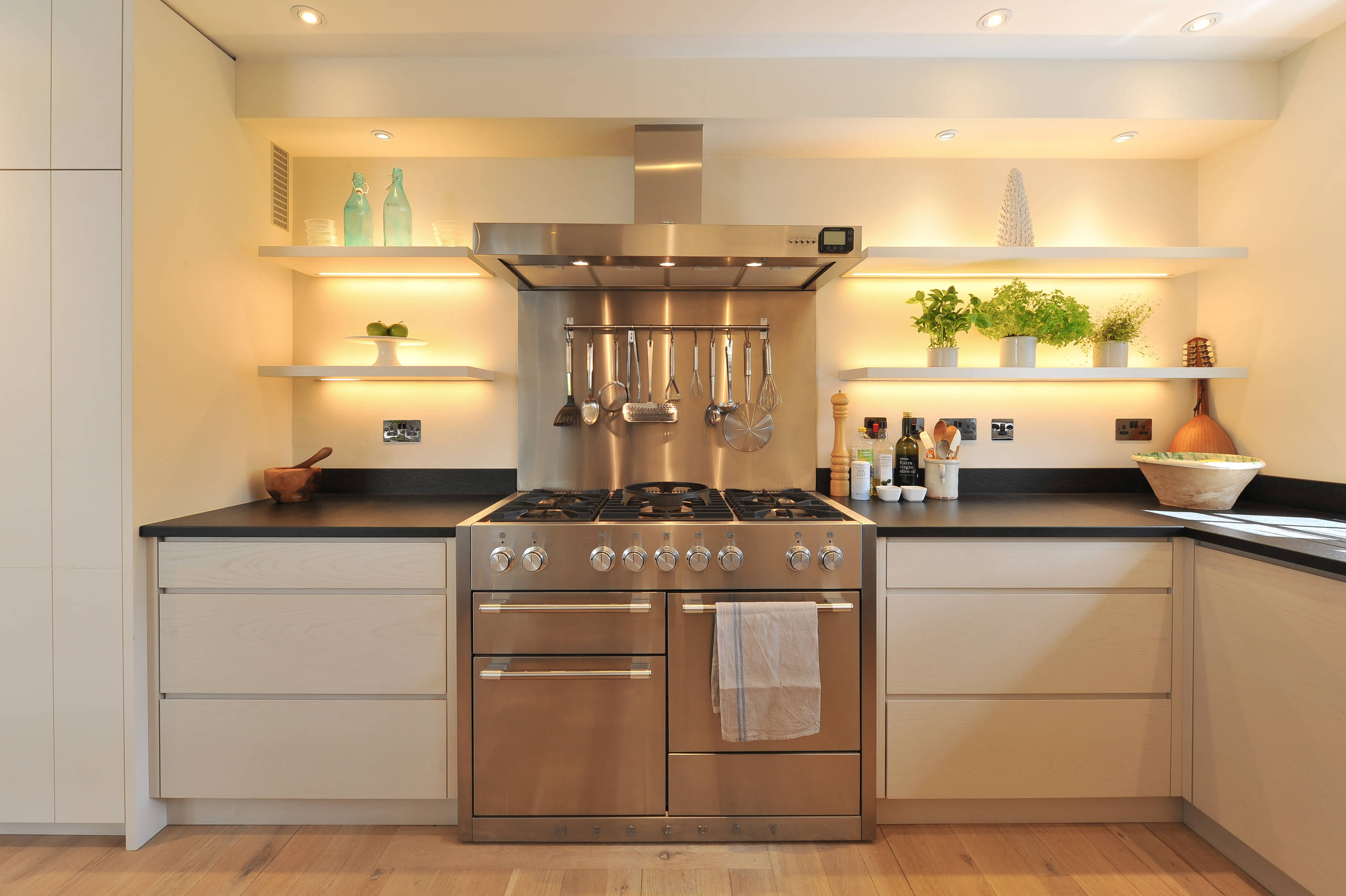 This ivory kitchen is a shining example of how accent lighting can augment obscure corners of a kitchen. Here, the glow from the built-in light panels illuminates elements both on and under the shelves and the recessed ceiling lights complement the lighting scheme perfectly.