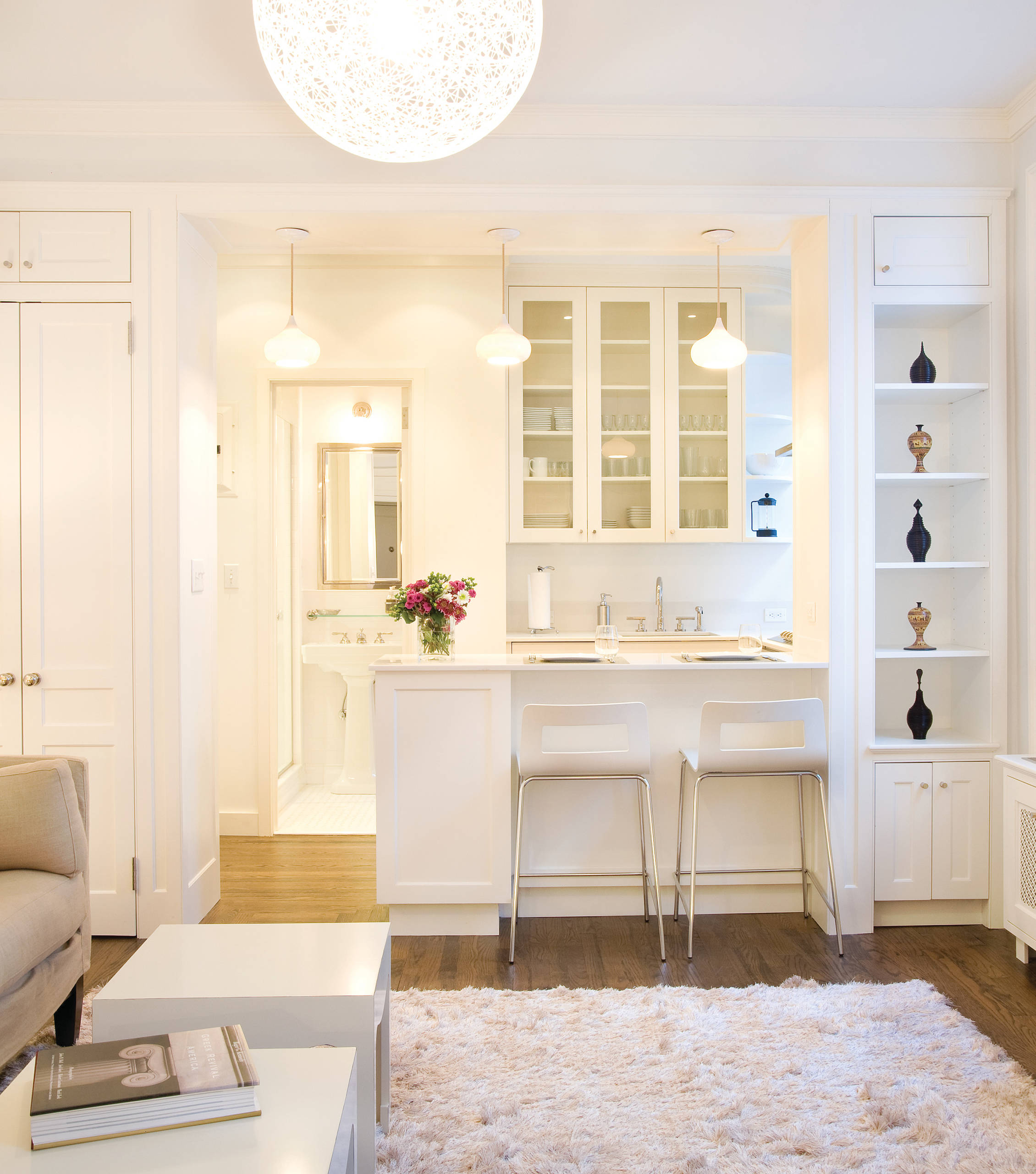 This Lilliputian kitchen is a perfect example of a zonal layout. The kitchen holds its own in this compact studio apartment, courtesy the soft pendant lights that form a welcome archway to the kitchen. Although there’s no formal screen that separates the living area from the kitchen, the warm lighting forms a unique access point. Zone lighting is a good way to spotlight a small kitchen without adding walls.