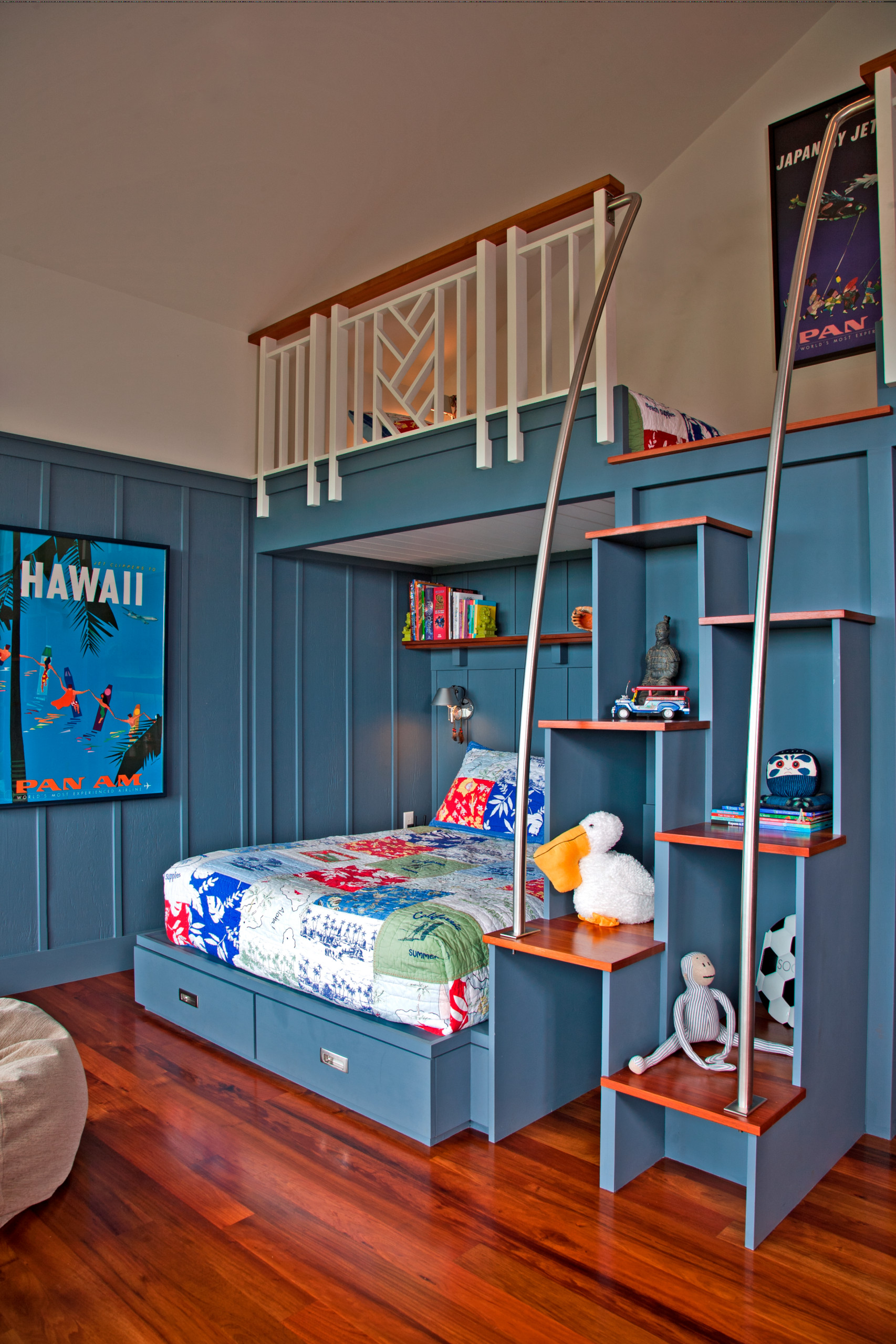 How about converting the bunk beds and display area into an adventure zone? Check how the staggered steps double as creative shelving units.