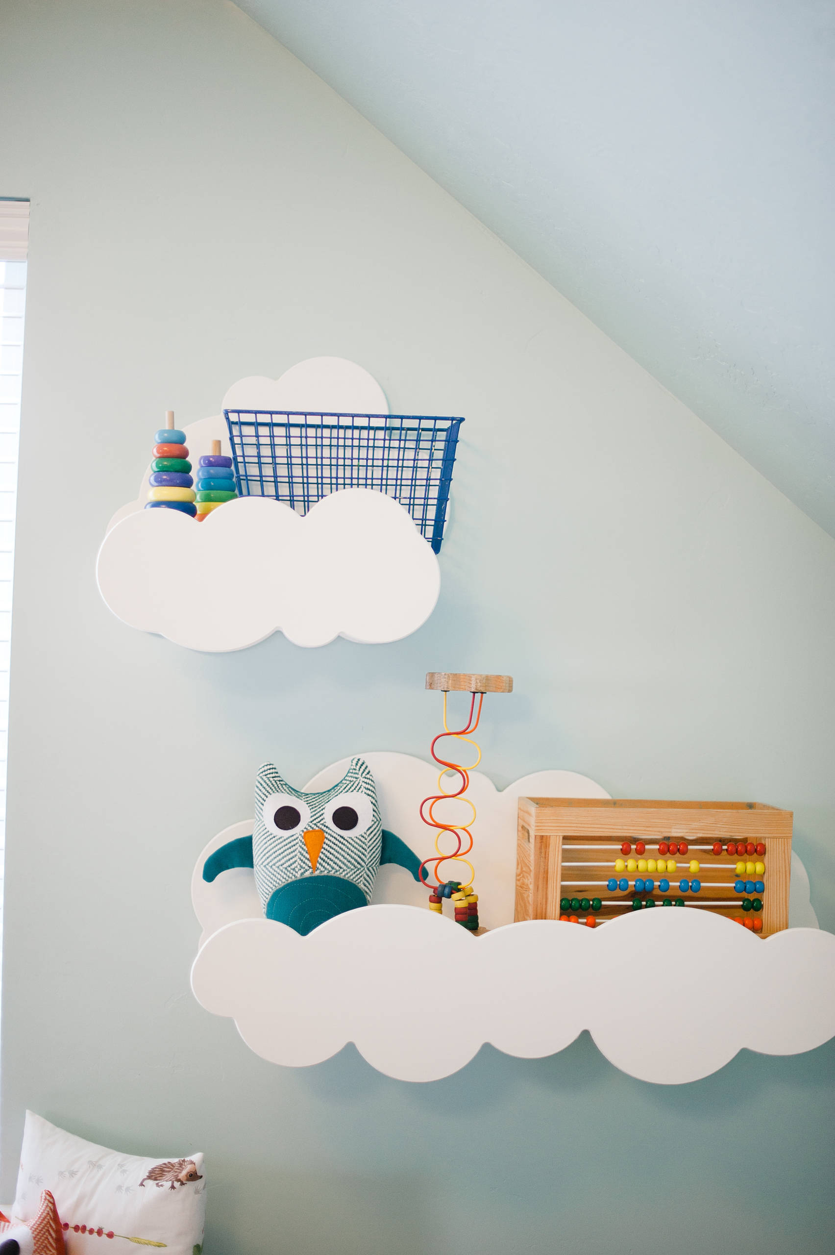 There is so much you can do with floating shelves. They bring an element of playfulness and are perfect places to drench in colours and patterns. In this image, just see how the shelves become floating clouds in the sky; you could even fashion them as little boats in the ocean or introduce odd shapes to hold toys.