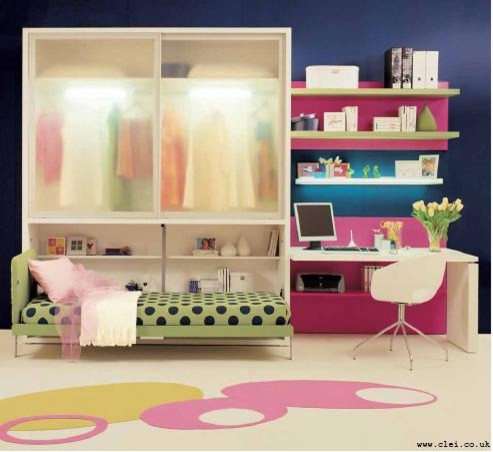 Take, for example, this space. Though it is essentially two rooms held together by an internal partitioning door, the idea it presents can also be employed in a one-room space. The two ends of the room are painted blue and pink respectively. Separate styles of beds, rugs and accessories create niches that are as different as chalk and cheese. I am sure your kids would love that!