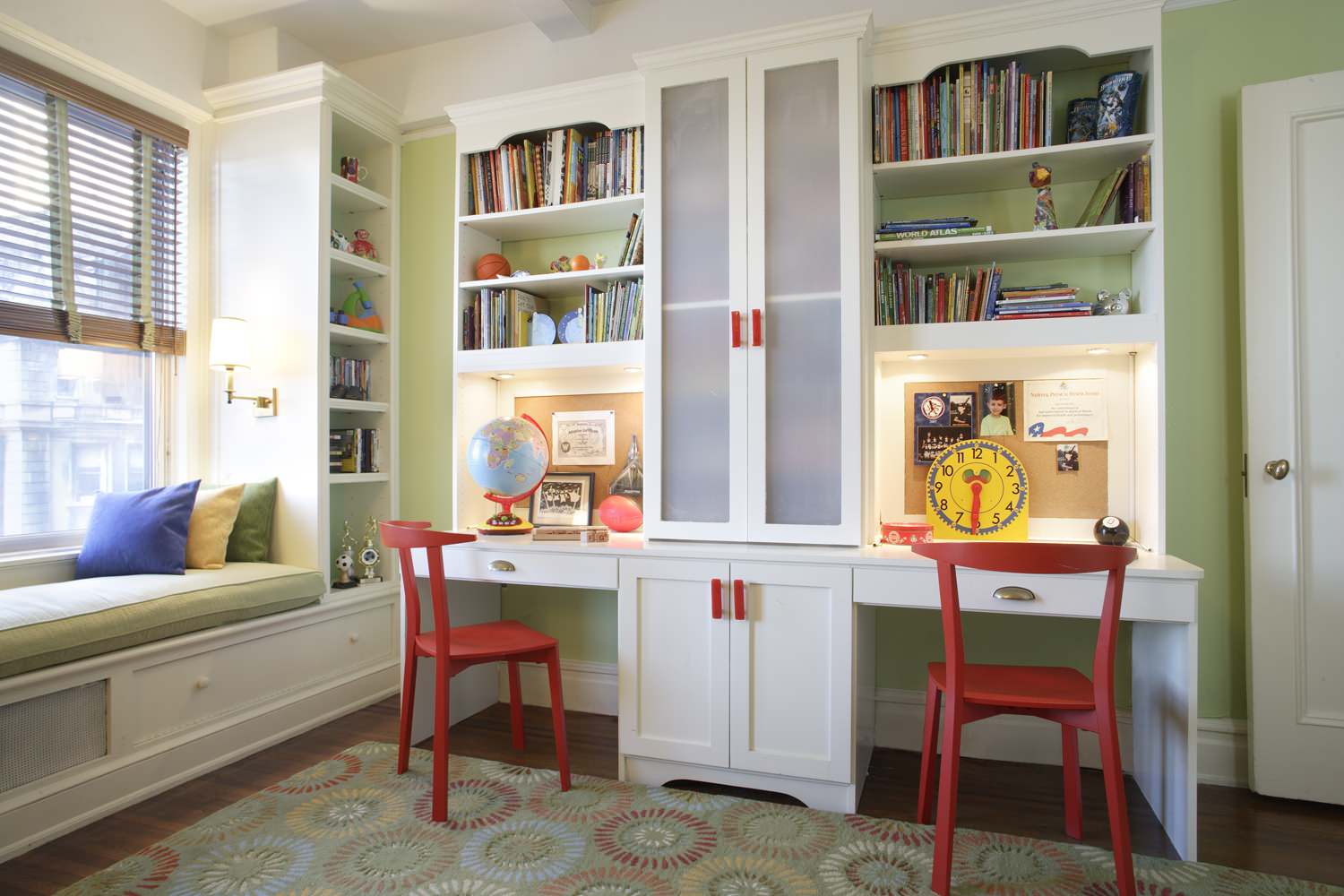 Study time requires peace and quiet. No matter how big or small the room is, it’s always best to have individual seats (and if possible, tables too) for the children to study in. See how, in this room, the brother and sister have separate shelves inside this large, all-white unit. The kids have personalised their tabletops with pictures, accessories and notes.