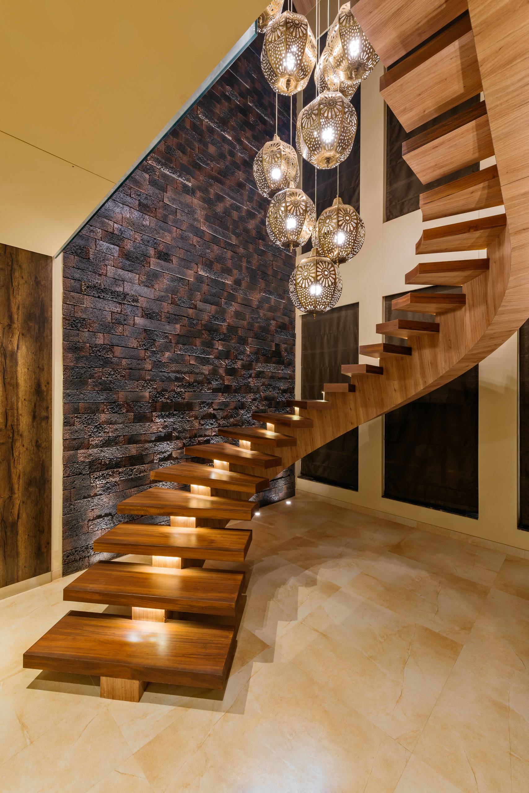Mansi Desai has designed a staircase that manages to be fluid and angular at the same time. A helical wooden block runs through the underside, acting like a spine that connects all the treads as it spirals upward. The whole structure appears to float unsupported in front of an accent wall, while spherical fixtures at different heights make for a dynamic element that accentuates the volume of the design.