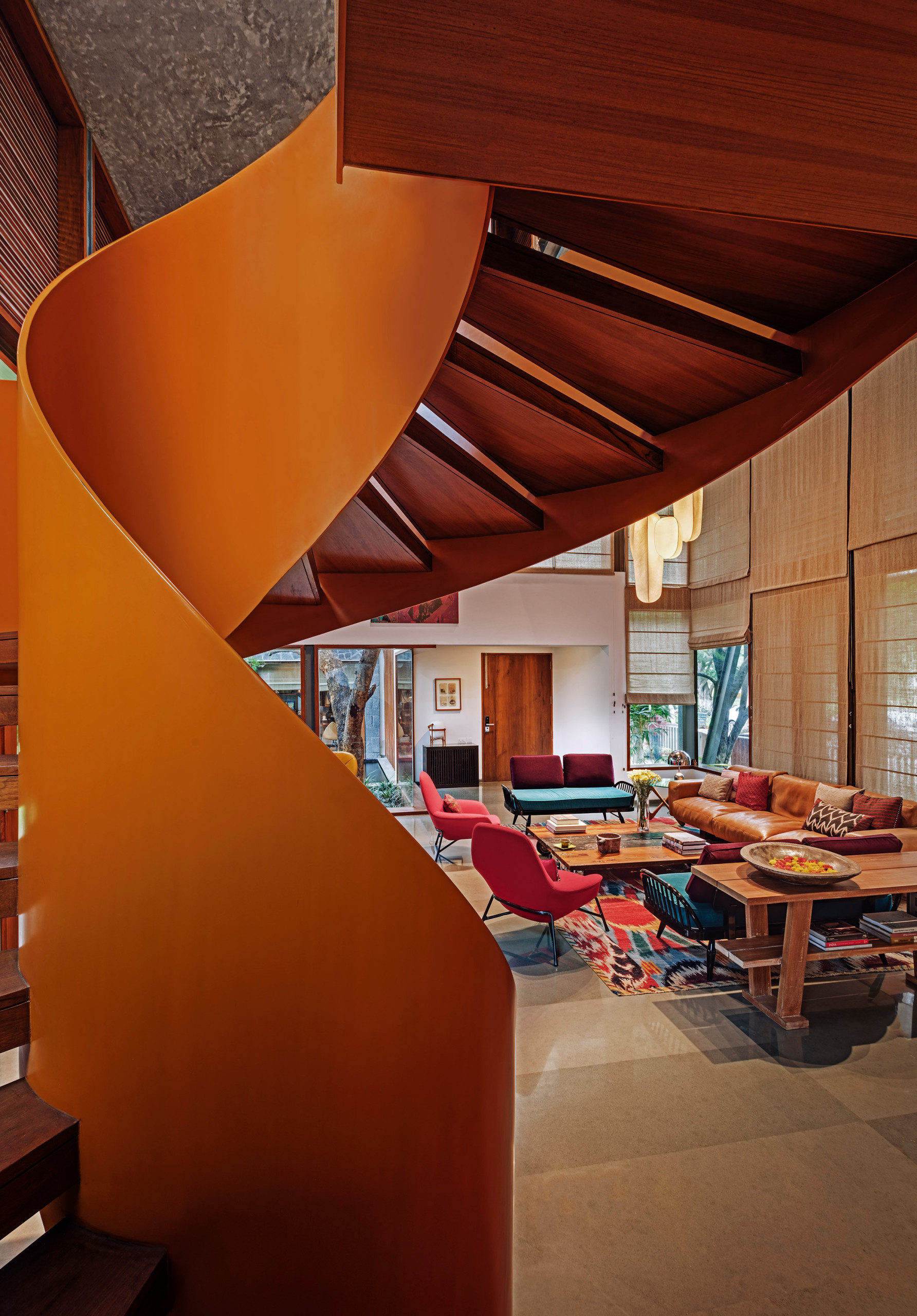 Most spiral staircases are usually conceptualised to be space savers, but this one has been visualised as a prominent sculptural piece in the living room. Made of a double shell of mild steel set with timber treads, its overall diameter is a generous 10 feet. Painted in burnt orange to contrast with the large swathes of polished grey kota stone (a fine-grained variety of limestone), the staircase is designed in a way that completely negates the need for risers. This was done by anchoring both ends of the solid teak treads in the steel shell, giving the structure a feeling of lightness.