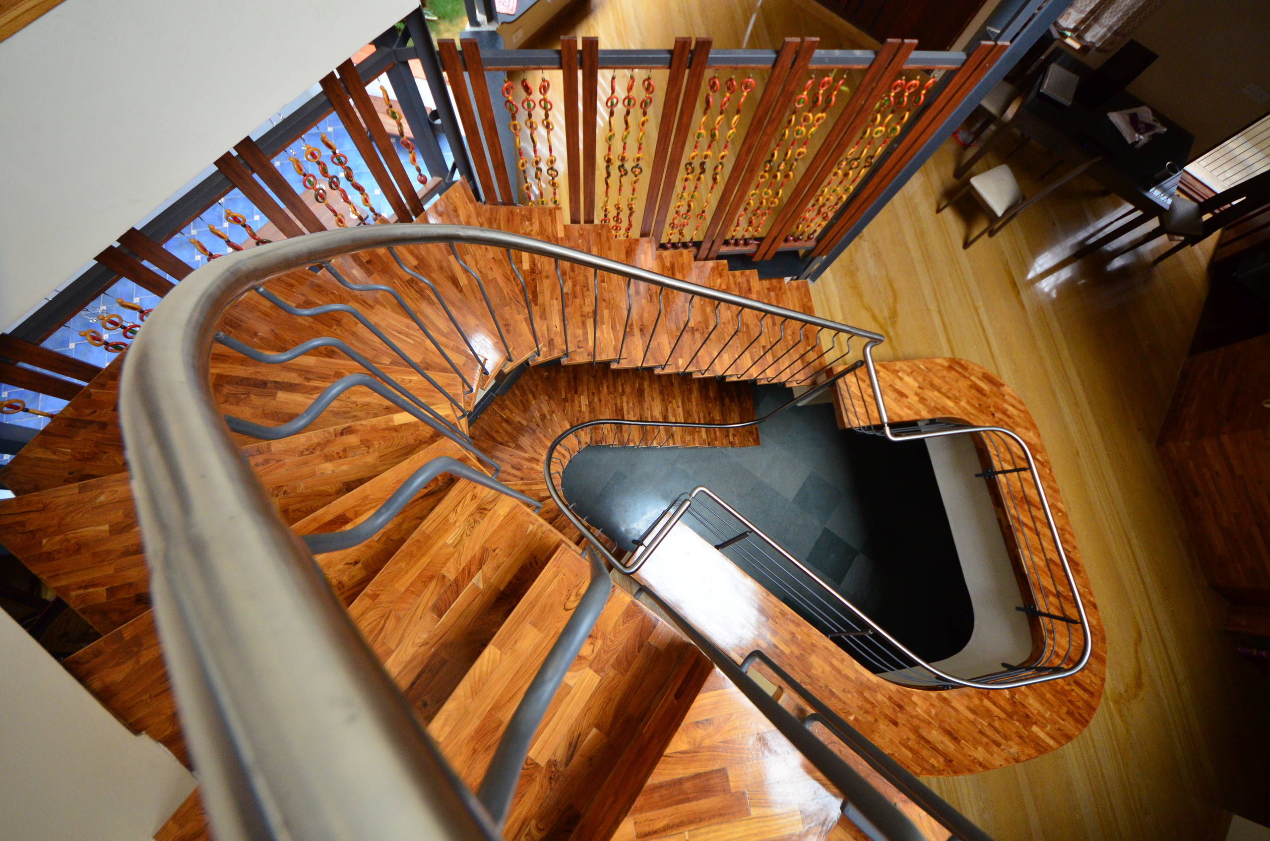 The fluid shape and wooden deck-like treads of this staircase by Wright Inspires make it the piece de resistance of this Bangalore house, while the open risers give it a stepladder-like feel. Also note how the sturdy metal railing adds a subtle touch of industrial bling to this otherwise predominantly brown space.