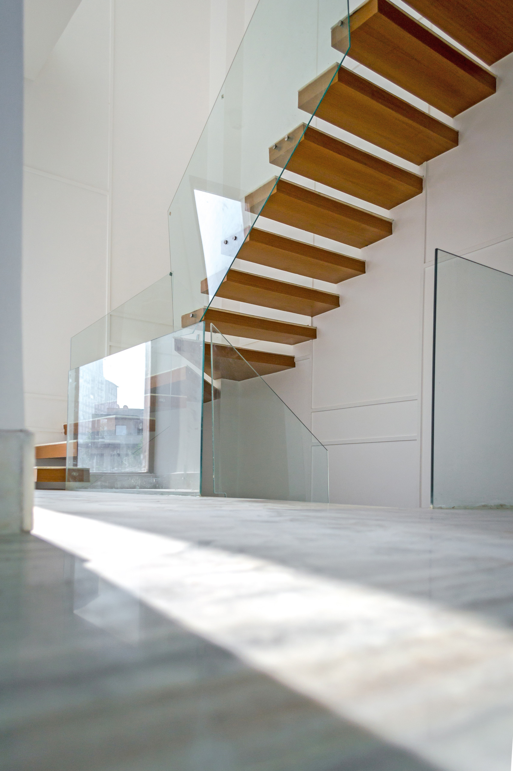 Who would’ve thought that a transparent staircase could make your jaw drop. Here, r+d Studio gives this contemporary space an airy feel while boosting sunlight levels with a classic combination – floating timber treads, white walls and a frameless glass balustrade.
