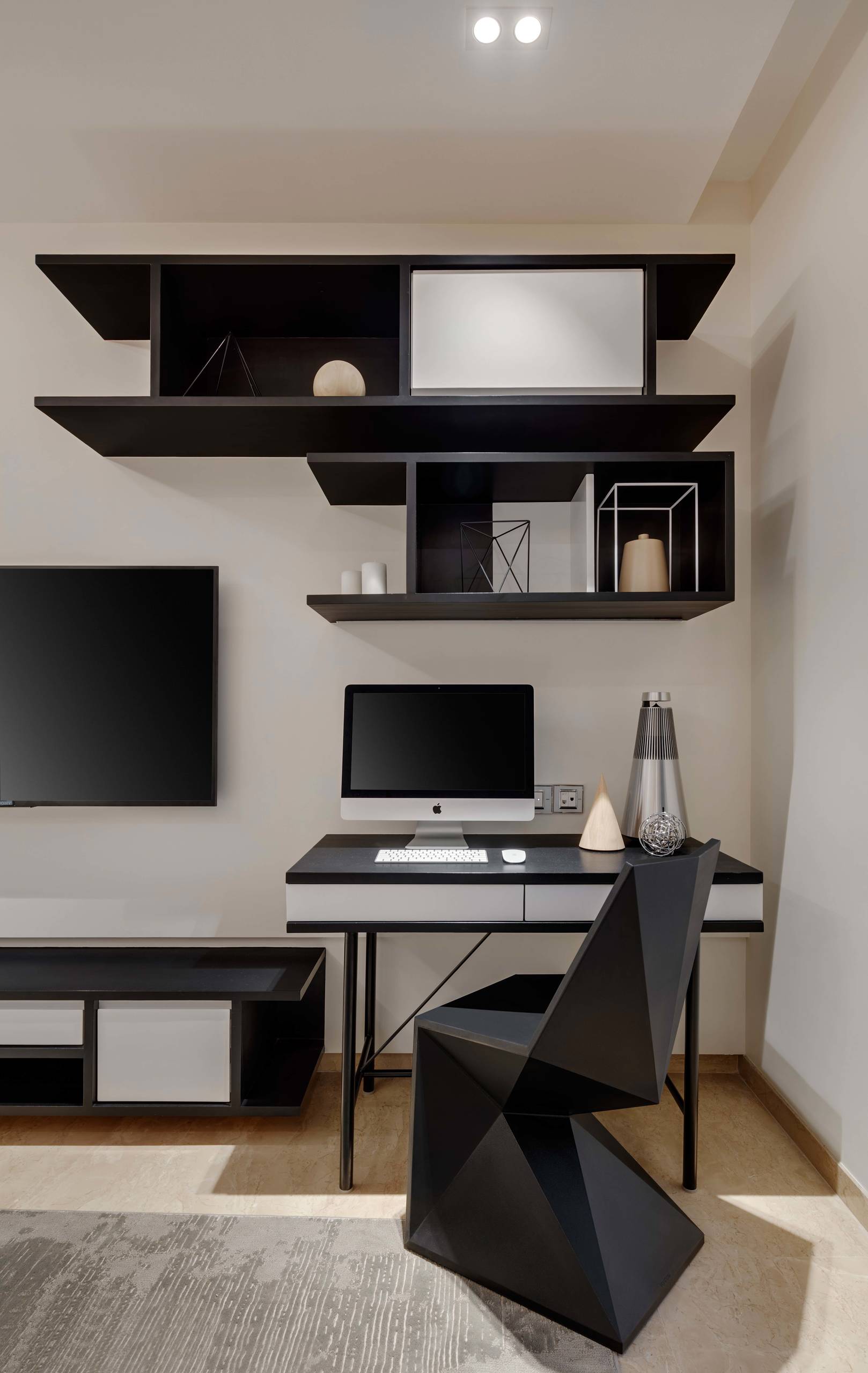 On the opposite wall, a television and a minimalist workstation with a striking chair are fitted within a modular arrangement of shelves. All the elements are characterised by structured lines and a monochrome theme of black and white.