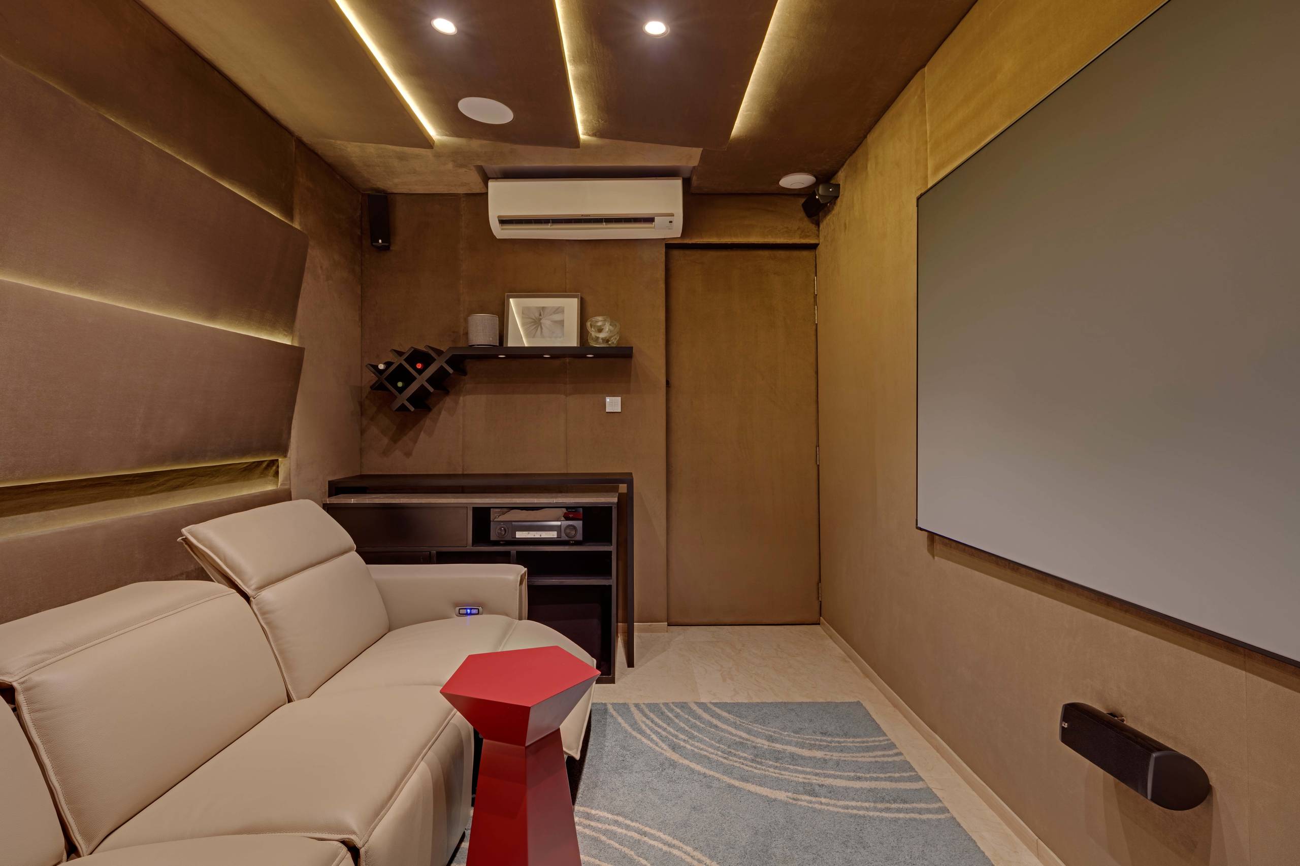 The snug home theatre plays host to a beige sofa and a projector screen. Angled overlapping backlit panels on the main wall and ceiling enhance the ambience.
