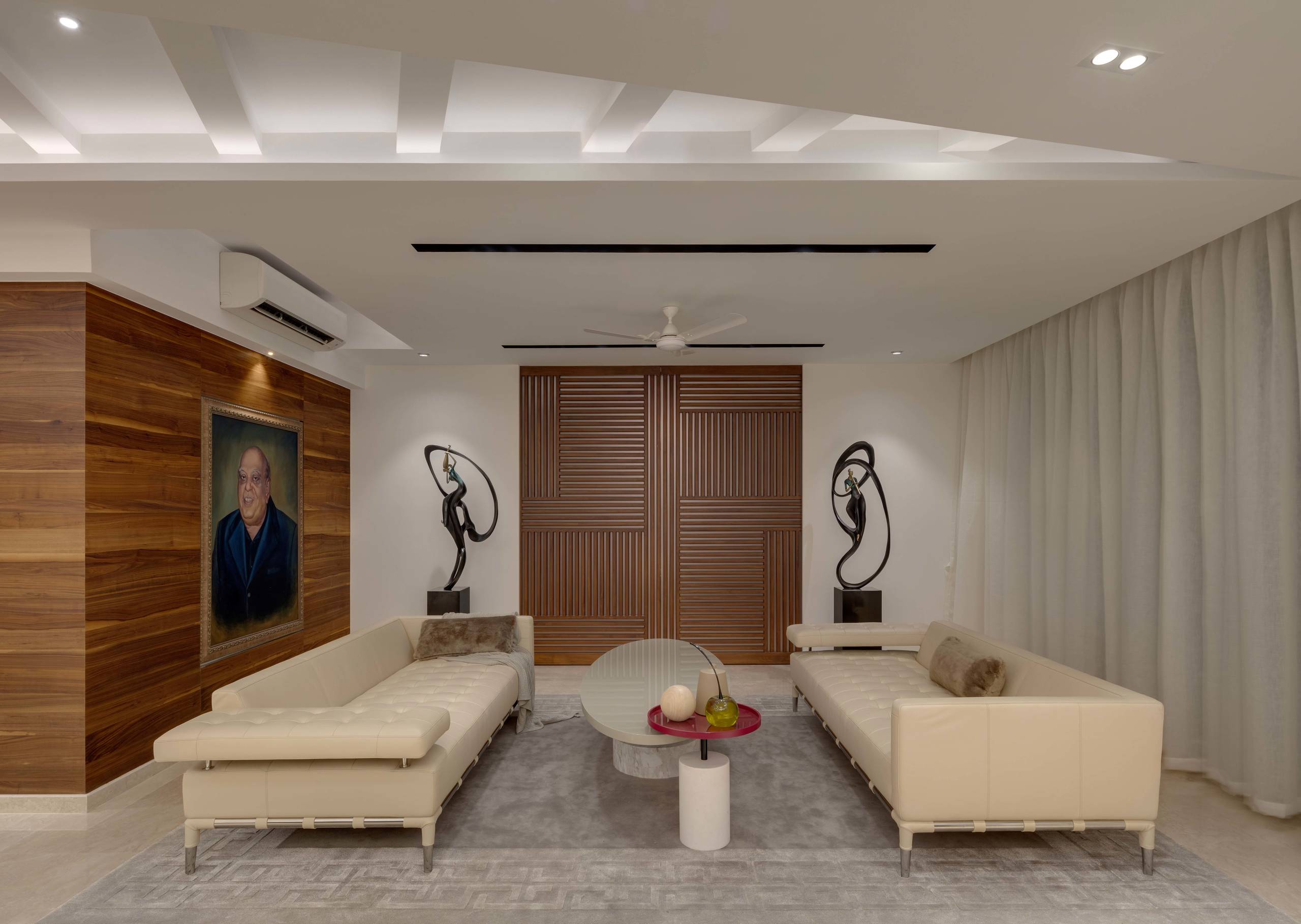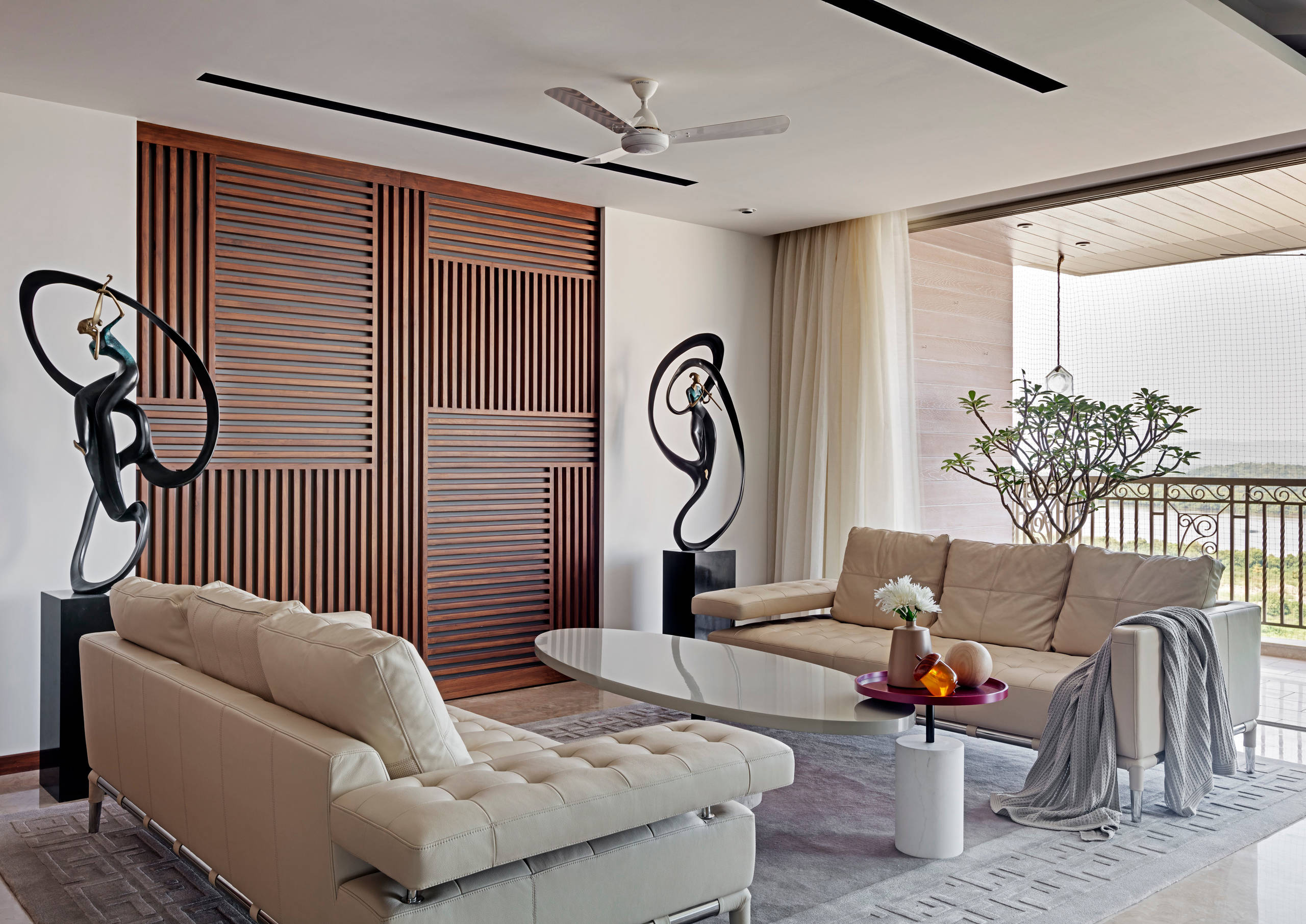 The living room is subtly divided into formal and informal zones. “Being a massive area, the idea was to break the space into smaller and warmer pockets for socialising, relaxing and dining. The interconnected open layout lends various layers of visual experiences,” Nair notes.