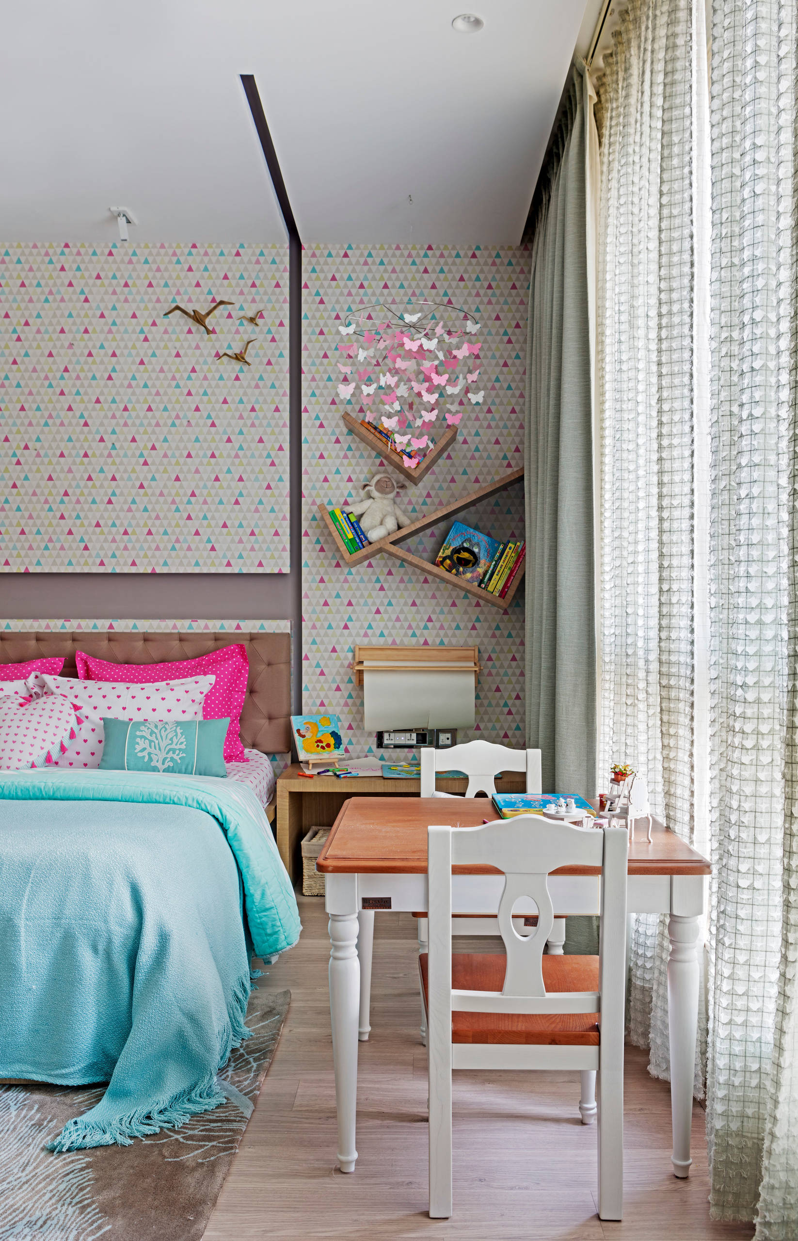 The whimsical backdrop, created from panels made of pieces of wallpaper, adds personality to the room, while a pretty wall accessory, depicting a burst of butterflies in shades of soft pink, looks like a page out of a fantasy storybook.