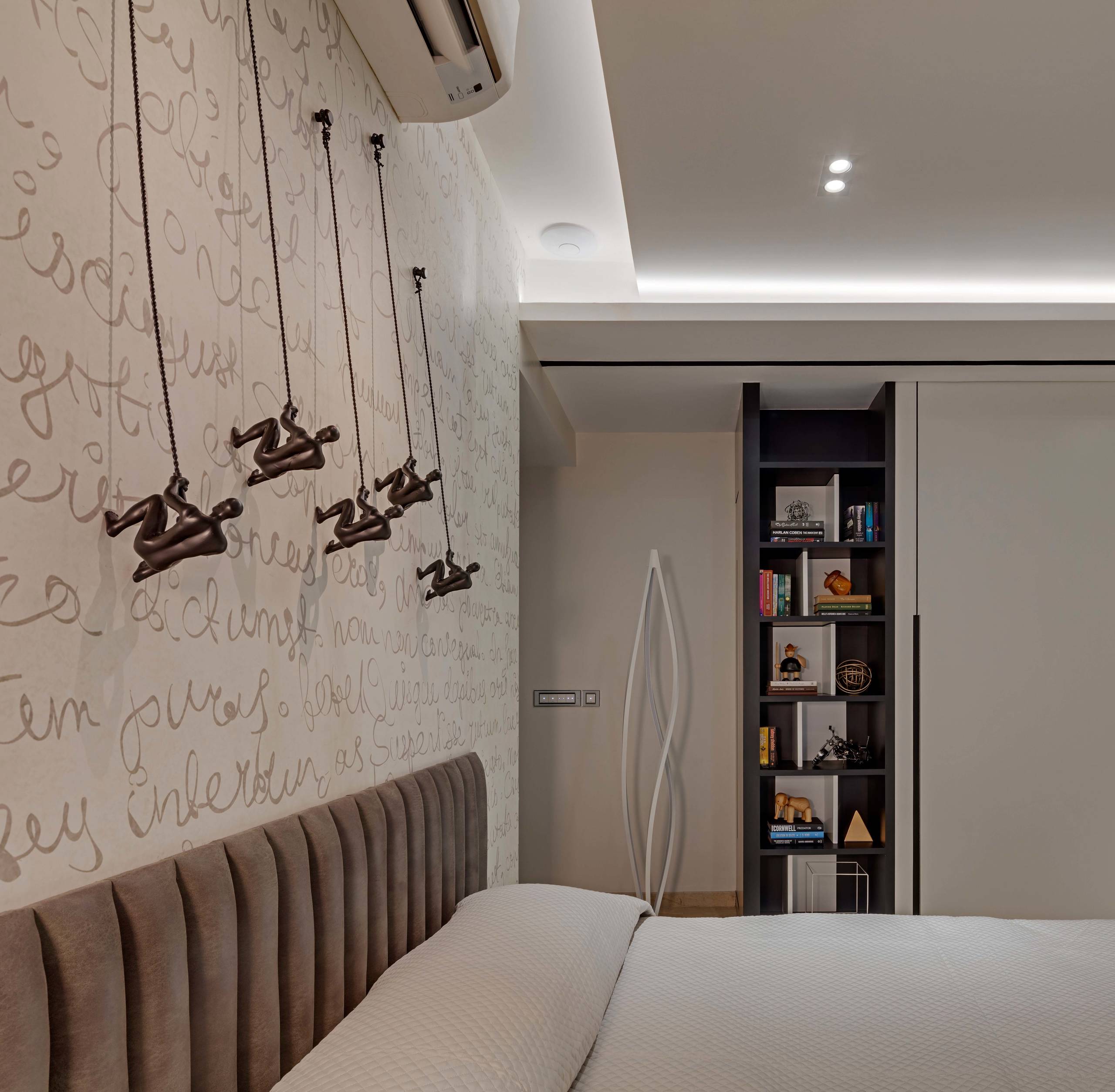 The son’s room is a marriage of contemporary charm and rustic rough-and-tumble. The wallpapered wall framing the headboard is an ode to the outdoorsy spirit of the room’s inhabitant. Decorated in muted tones, it is embellished with metallic statuettes depicting a team of mountaineers rappelling down a cliff.