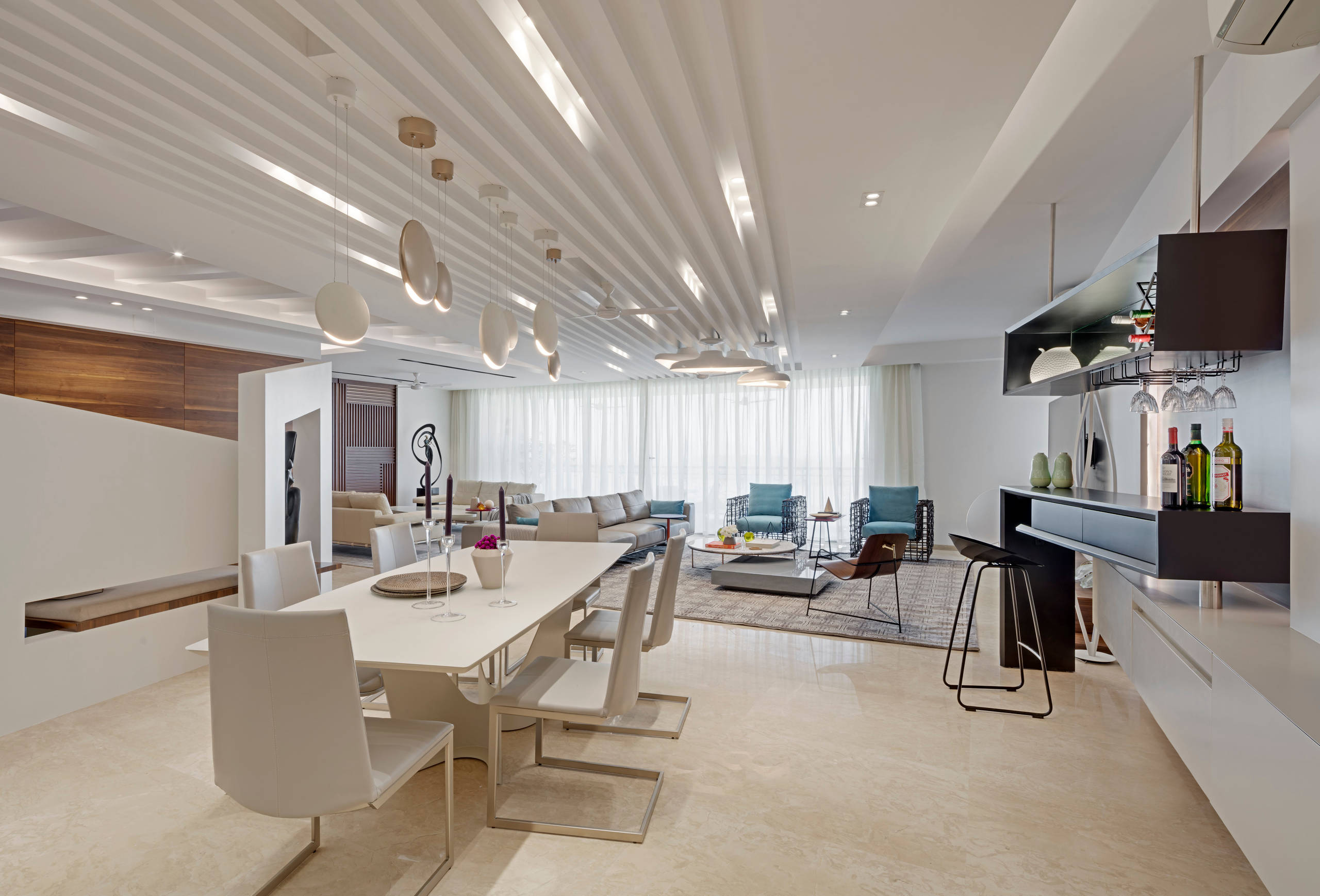 In an extension of the living area lies the dining area, highlighted in a harmony of pristine whites. “The elegant white dining set was used to give the space a contemporary look, and the white-and-cream overhead pendant lights added to the effect,” says Nair.