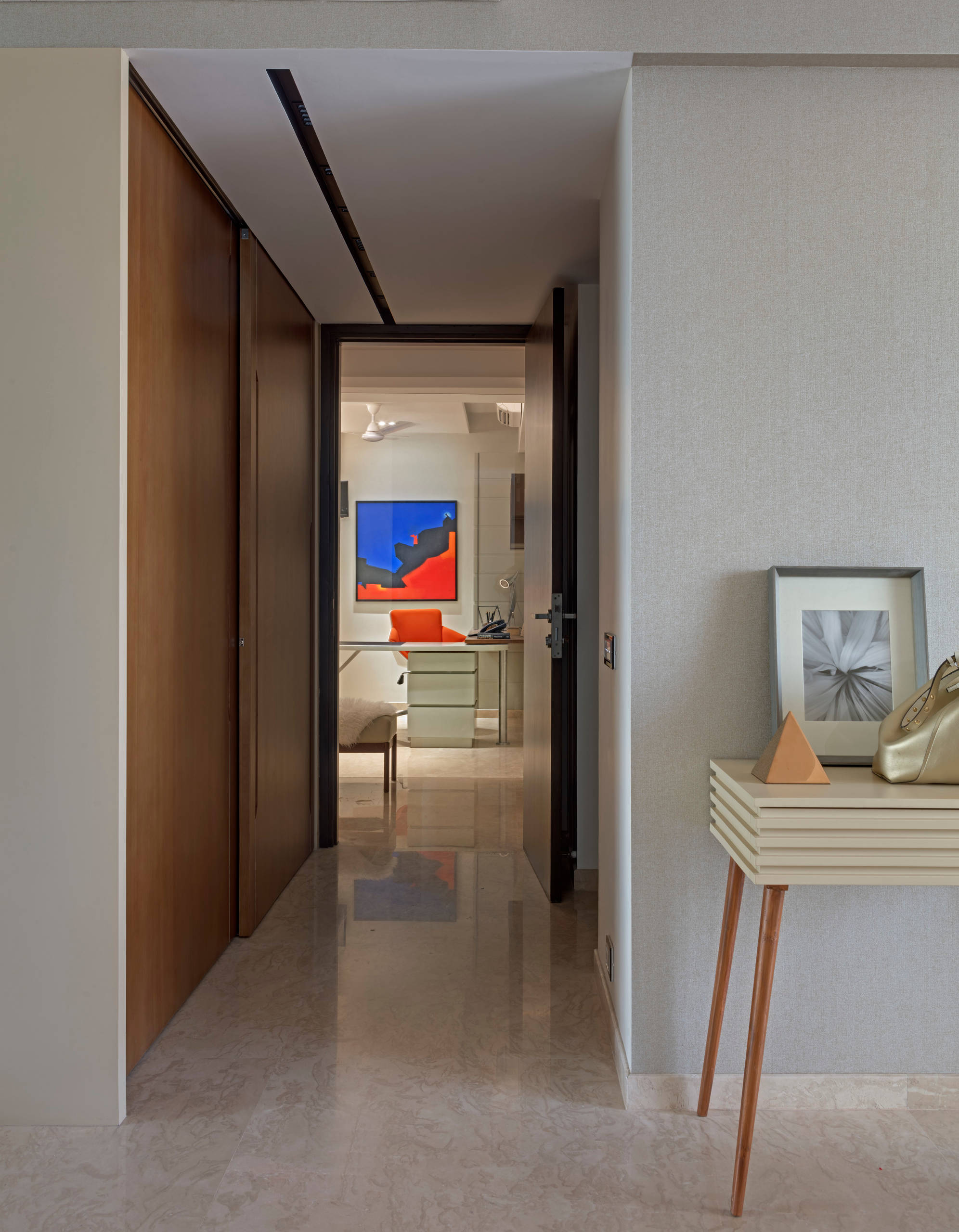 The informal seating area leads to the puja room through imposing floor-to-ceiling doors of teak wood and acrylic . The door’s panels are embellished with whisper-thin cutouts that artfully represent the sacred swastik symbol.