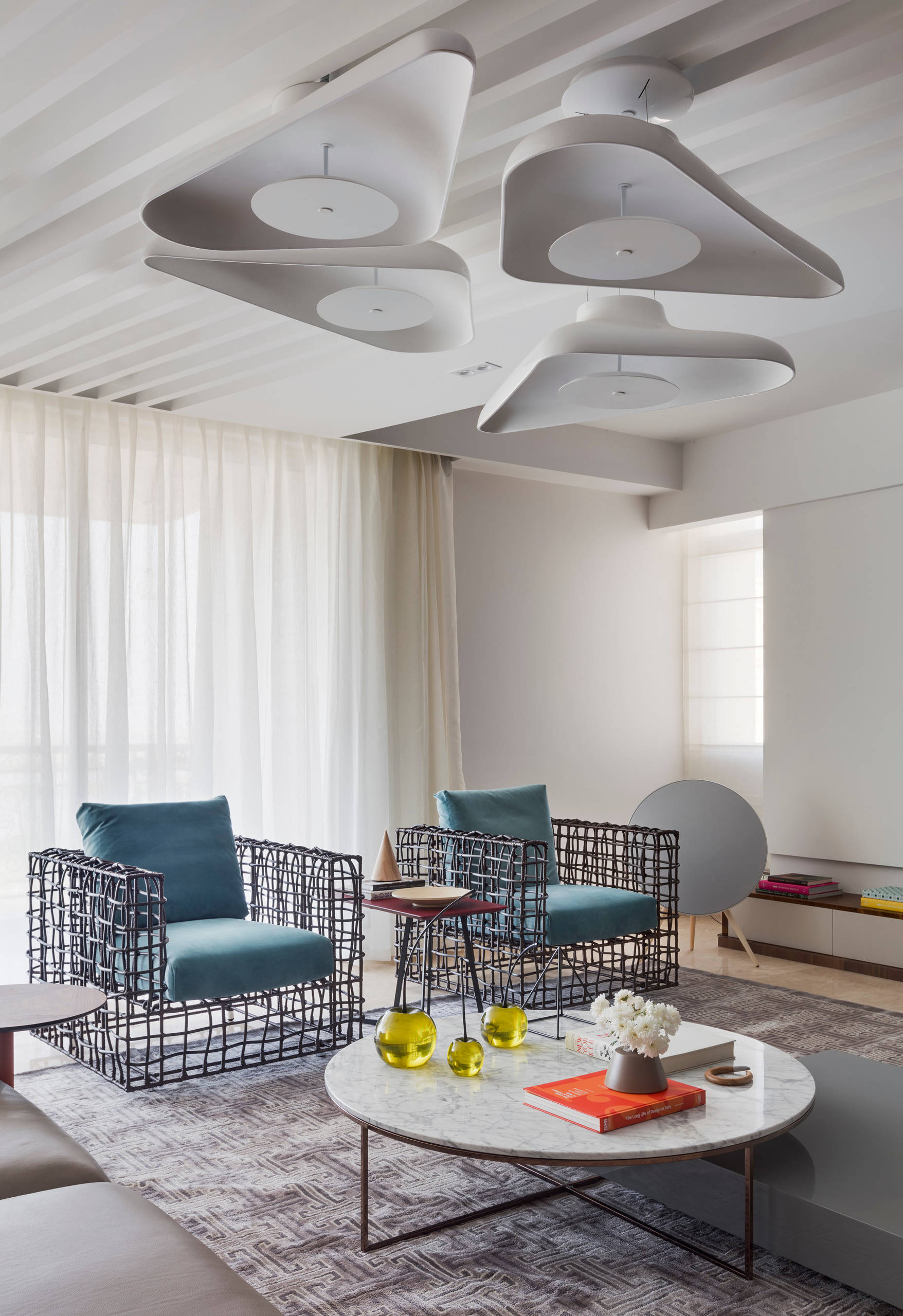 Designed as a separate section, yet spatially connected to the other half of the living room, the informal seating area, also overlooking the balcony, is a medley of artistic accents and soft colours. The cream sofas are a take on a design by Poltrona Frau.