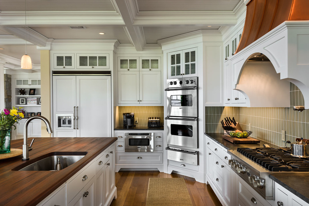 This kitchen begins with a large built-in refrigerator with an ice and water dispenser. A microwave and coffee maker come next before transitioning to the cooking centre, which hosts a double oven and warming drawer, and a large professional-grade cooktop to the far right. The sink and dishwasher in the island complete the work triangle positioned comfortably between the cooking and refrigerator centres.