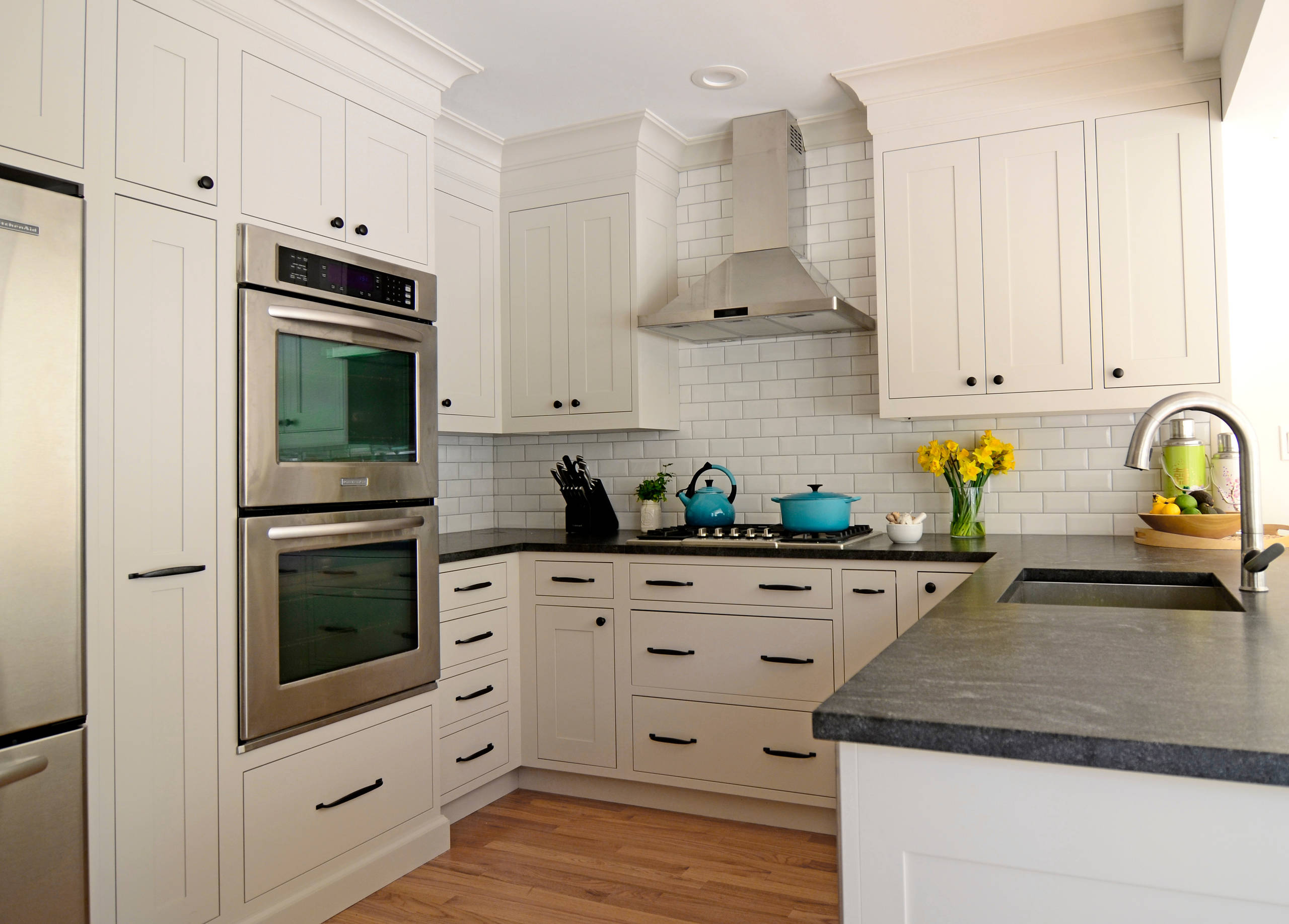 Efficient but thorough should be your thoughts when putting together a starter kitchen. This example has a simple 30-inch-wide range and a built-in microwave oven strategically placed next to the fridge. The U-shape provides an efficient work triangle but allows enough space for a couple of cooks to work together.