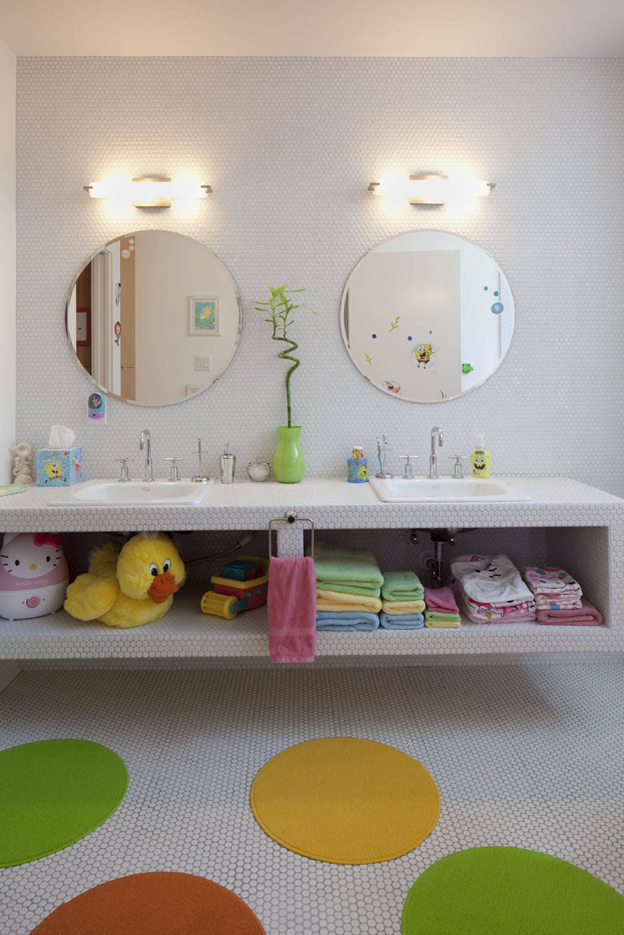 This child’s bathroom doesn’t need colour on the walls to feel fun and fabulous. Accessories in green, yellow, orange and pink give it a whimsical look without taking away from the classic finishes. And I love how the round mirrors match the carpet circles, bringing harmony to all parts of the room.
