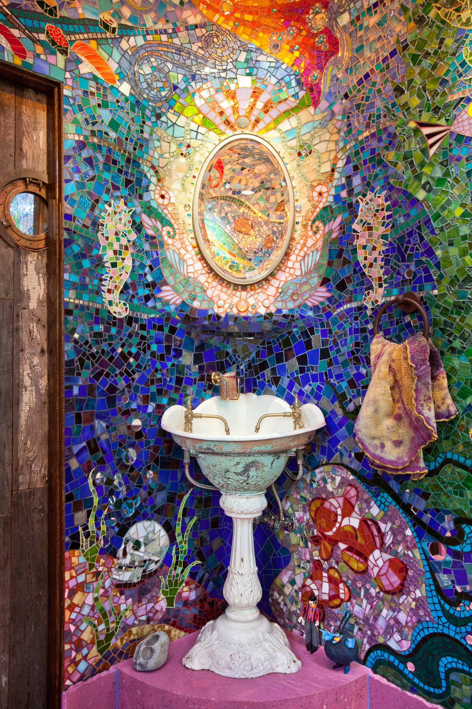 Another way to highlight the sink area is to go all out – check out this over-the-top, bold, marine-inspired mosaic wall: sea horses, fish, seaweed and even skulls (remember Davey Jones’ locker?) fill the walls with polychromatic whimsy. A visit to the loo becomes a trip into gorgeous undersea fantasy. The vintage style washbasin with golden taps and the gold oval mirror add to the bathroom’s colourful aquatic fairytale effect.
