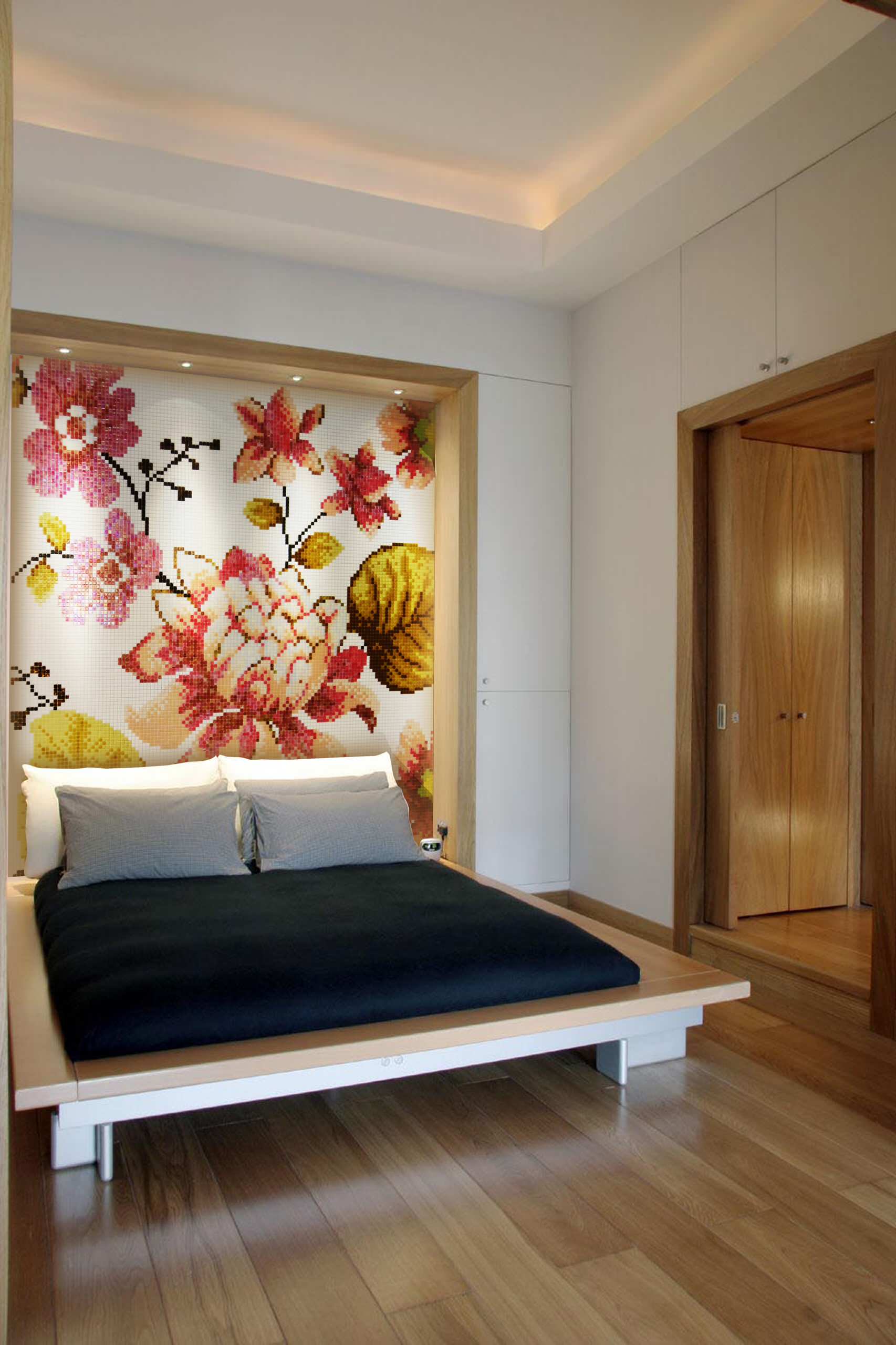 5. These bold, large mosaic flowers transform the look and feel of this bedroom. Breaking the monotony of brown and white, the area behind the bed introduces colour and creativity.