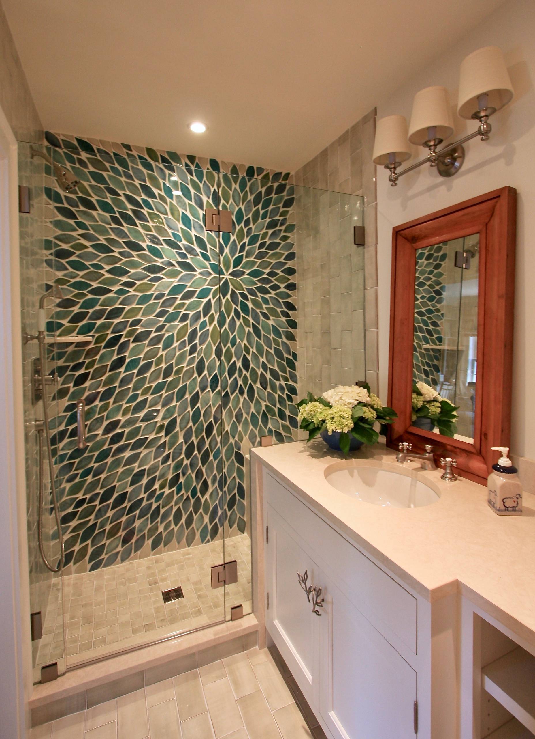 A shower area with an intriguing, optical-illusion style mosaic wall … are you hypnotised? The tiles, in varying shades of green, are put together in such a way that they make the wall look like it’s contracting and receding. Like it? Bookmark it.