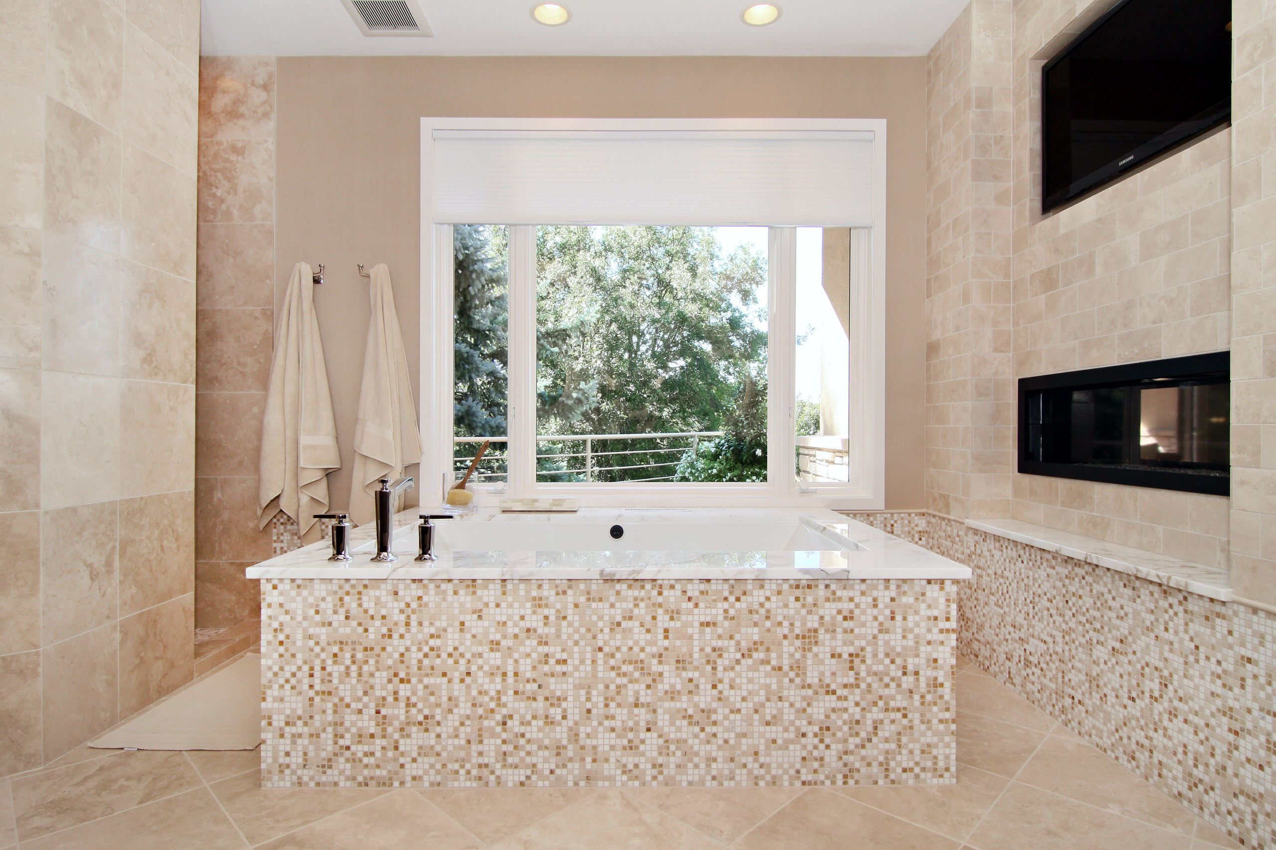1. Glittering, gleaming and grand … this bathroom can brighten the bleakest of mornings. I like how the luxe mosaic bathtub complements the beige flooring and walls, making the washroom look like one large soothing space enhanced with shimmering details.