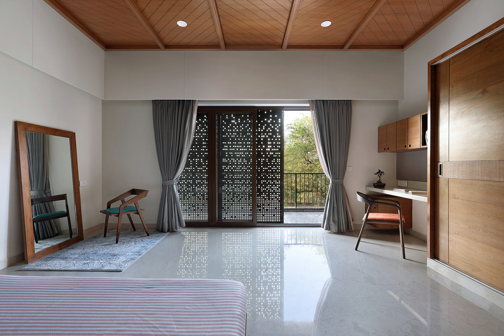 While marble flooring and plain white surfaces keep the interiors cooler and visually light, shading treatments (like overhangs and perforated screens) on the openings help control the indoor temperature effectively.