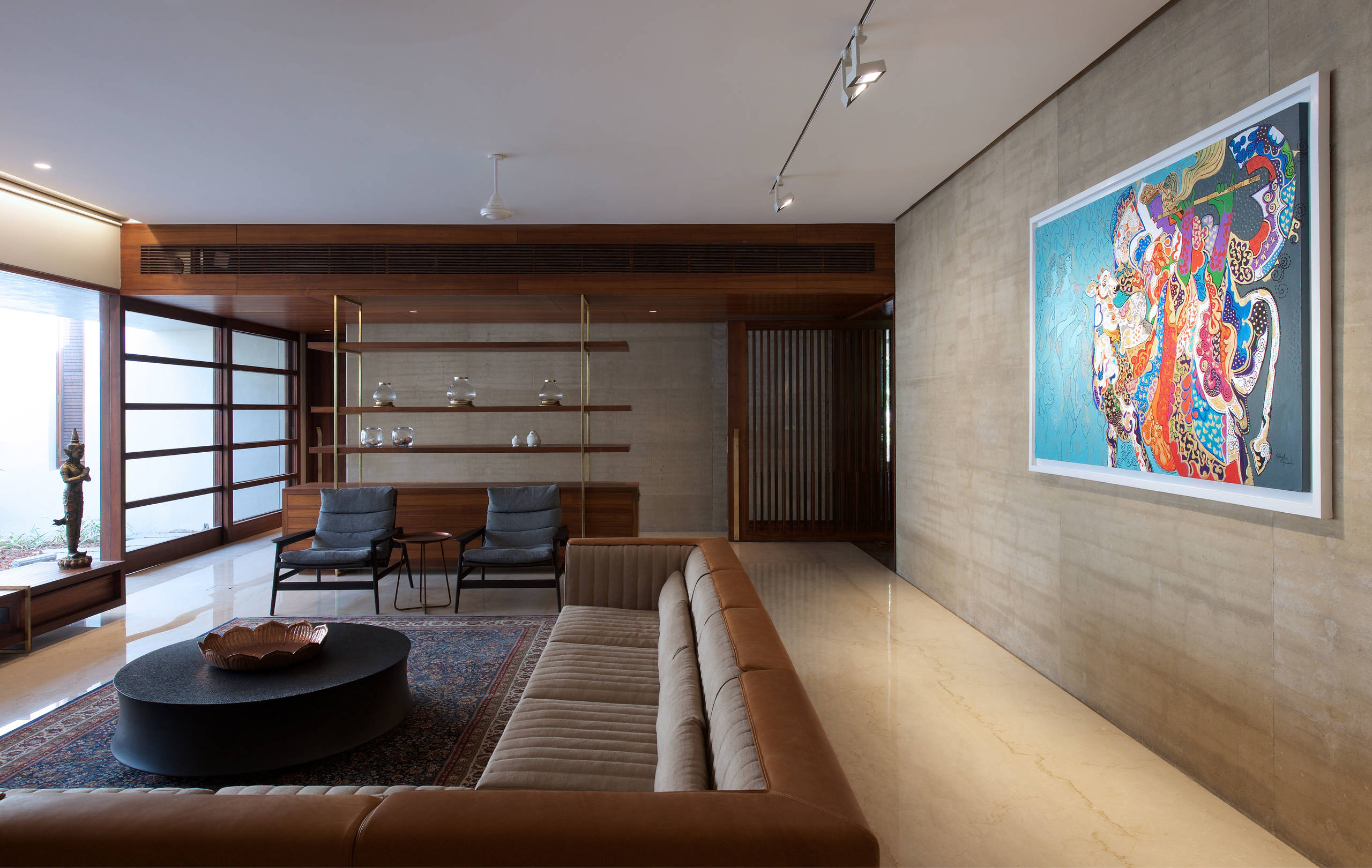 The living area of the home opens out onto a shaded open courtyard that not only provides respite from the heat by producing a stack effect but also fills the interiors with diffused light.