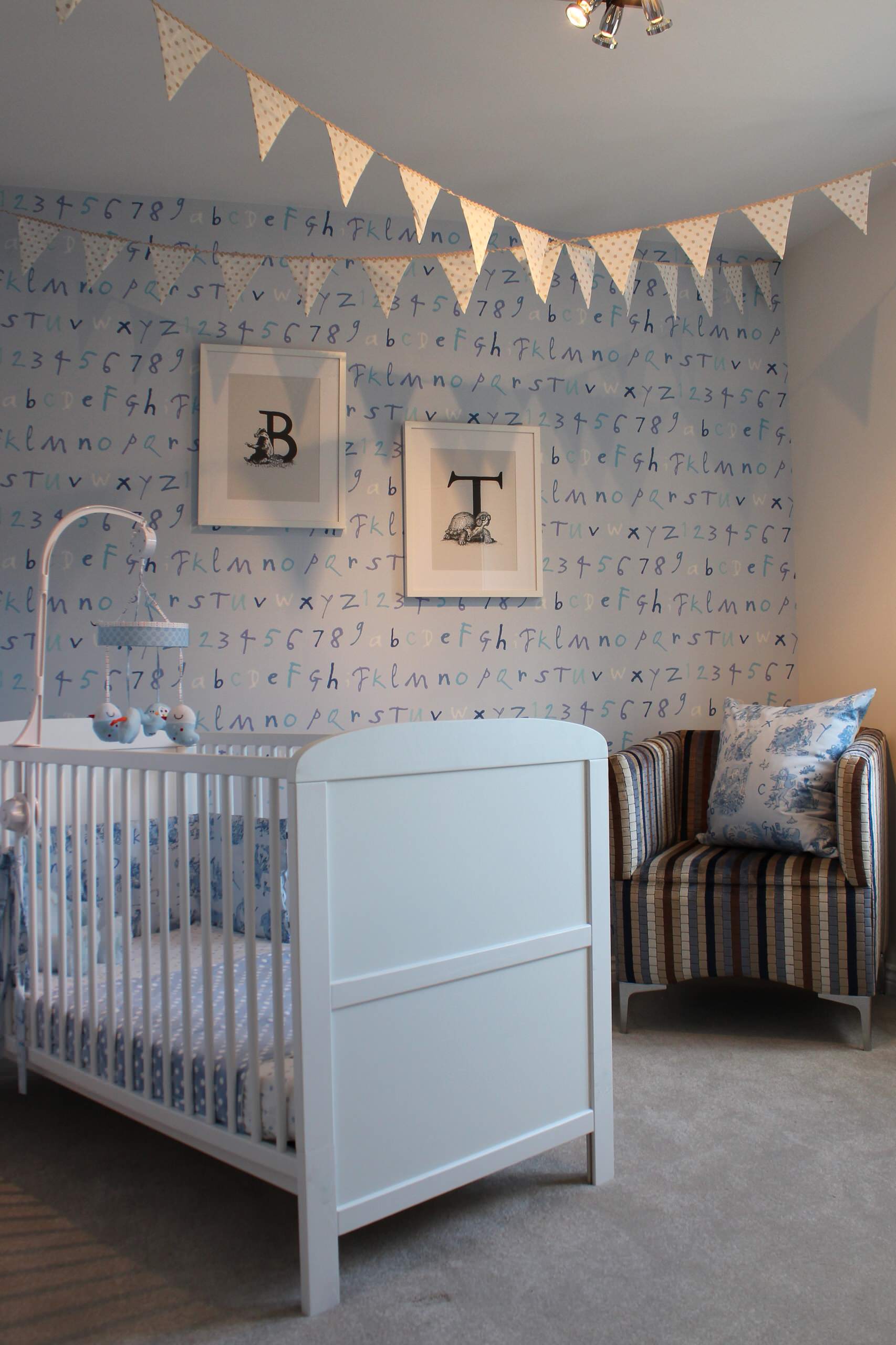Typography works beautifully in a child’s room, helping them learn their letters from a young age. Here, wallpaper with a design by illustrator Quentin Blake is topped off with the framed initials of this room’s young resident.