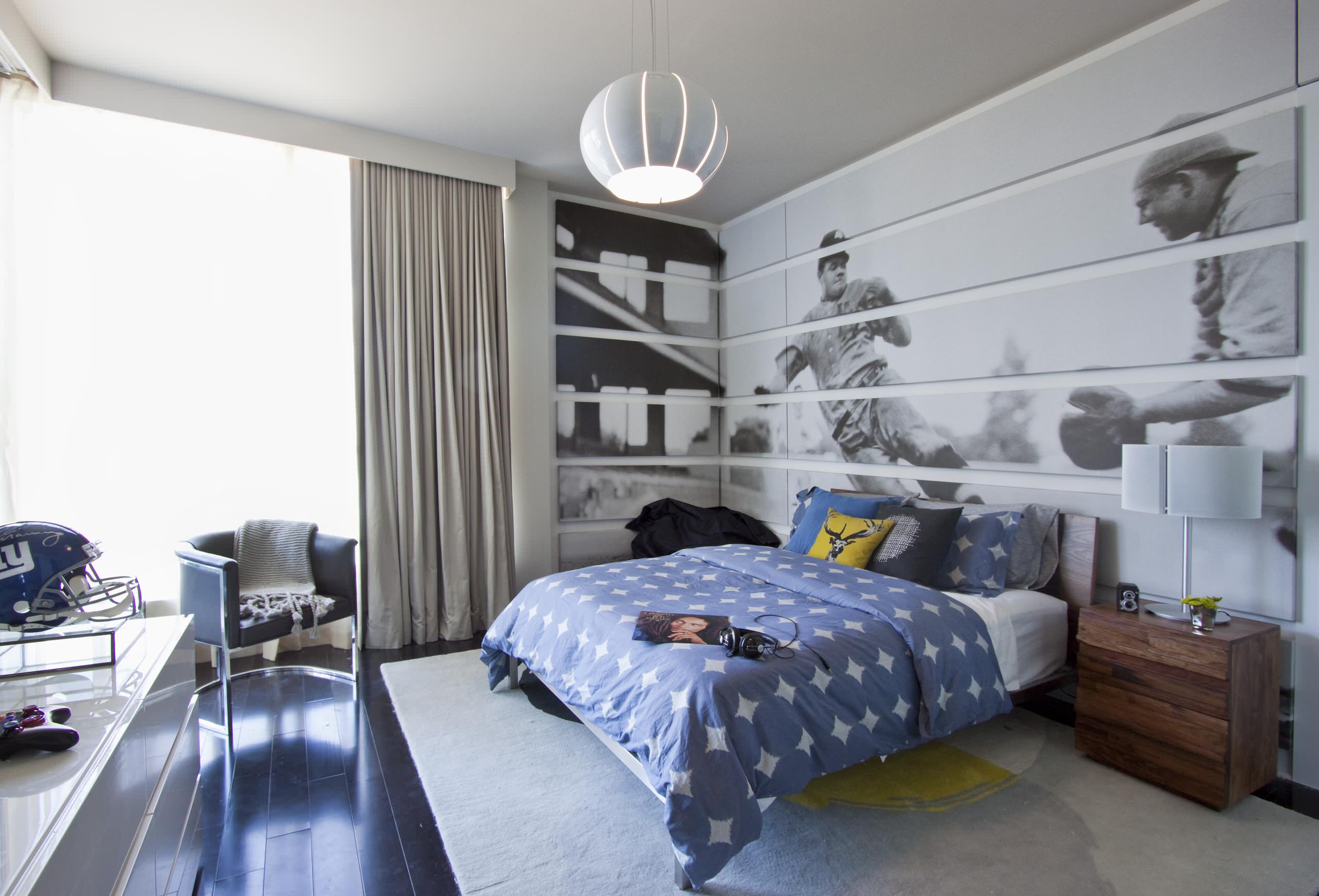 Getting a photograph blown up creates a large-scale wall covering that is more personal than wallpaper. Here, a baseball image has been reproduced on panels for an exciting, graphic effect.