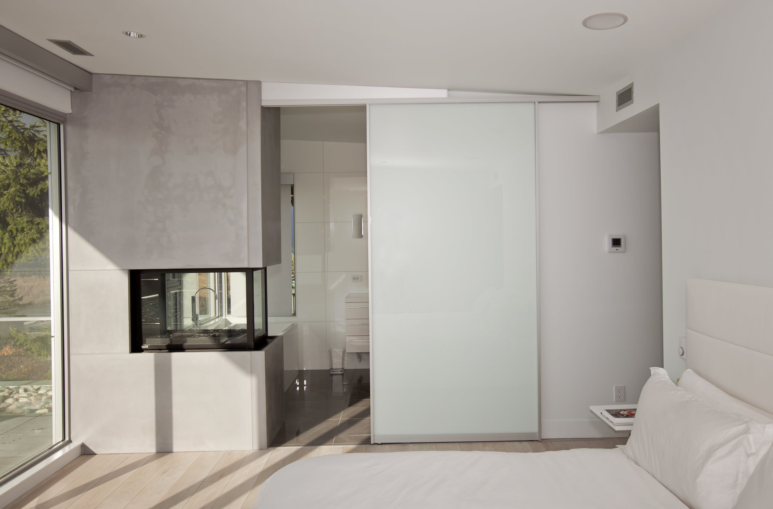 In this example, toughened glass windows forms the external skin of the room to form a brilliant indoor-outdoor connect. It lets ample light into the interiors and makes the space look larger.