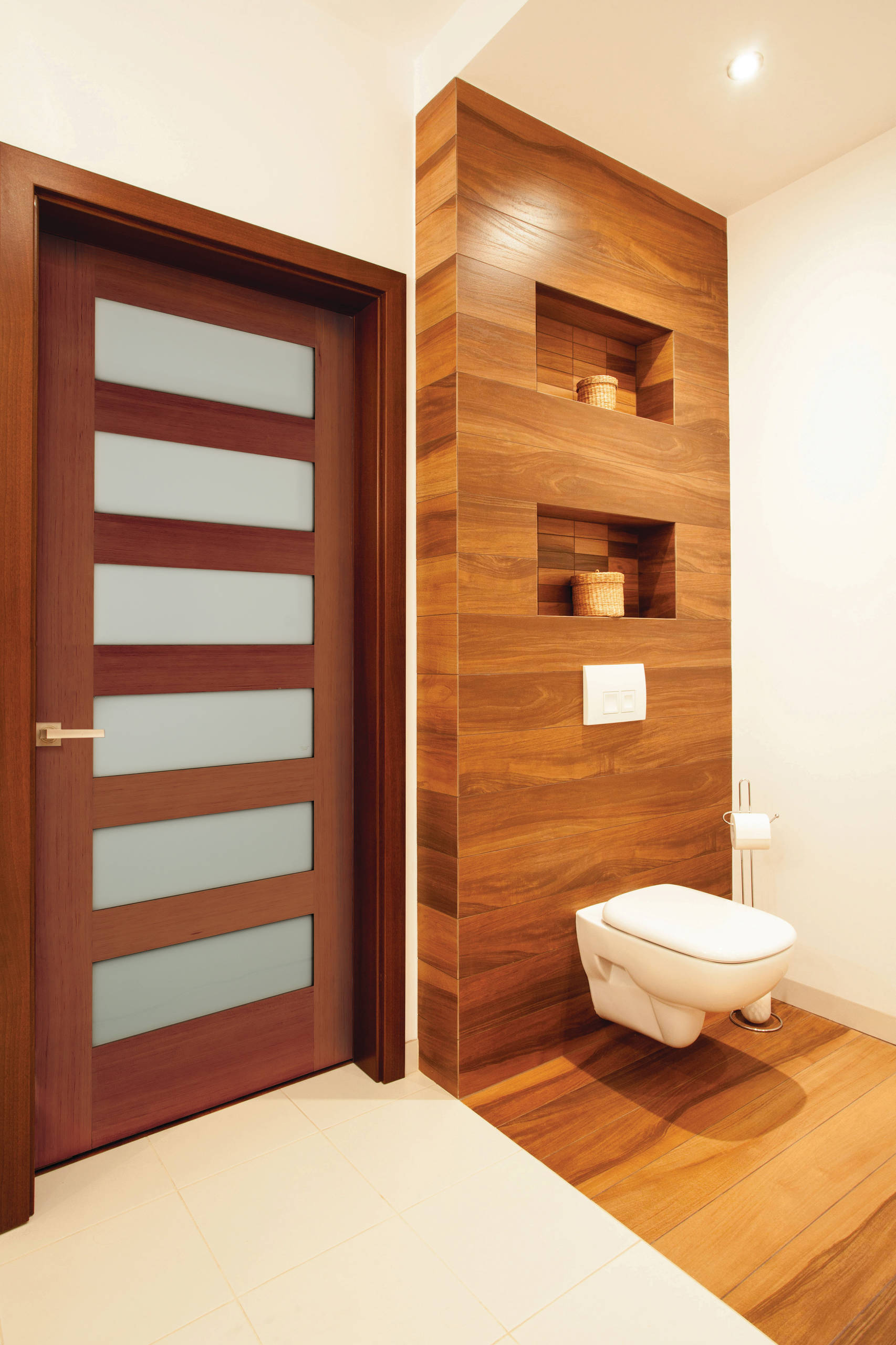 - The size of the door should be 30–33 inches, but if there is a space constraint one can go for a 28-inch door. Make sure that when the bathroom door opens, it does not hit the commode or the vanity.