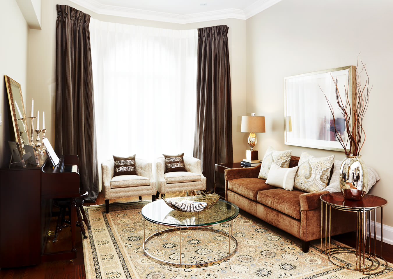 The espresso-hued brown curtains add a large dollop of deep colour to the untouched cream walls, creating a striking contrast. The cinnamon-brown sofas add another layer to the brown-and-cream palette of the room, all tied together by the carpet. The result is a sense of spaciousness (from the walls) and warmth (from the browns).