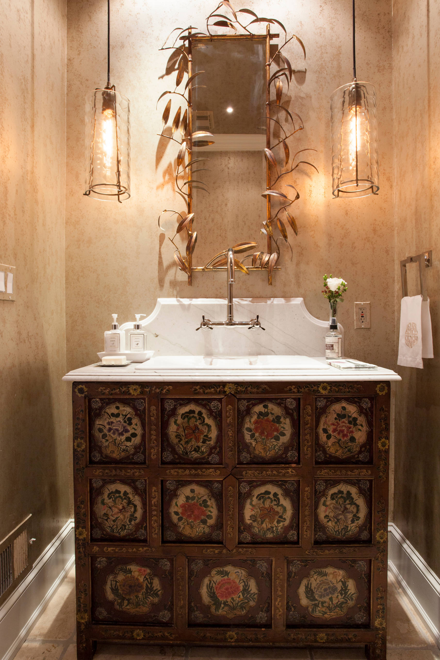People often place the bottom edge of the mirror above the faucet, but in fact allowing the two to visually overlap can create a very elegant effect.