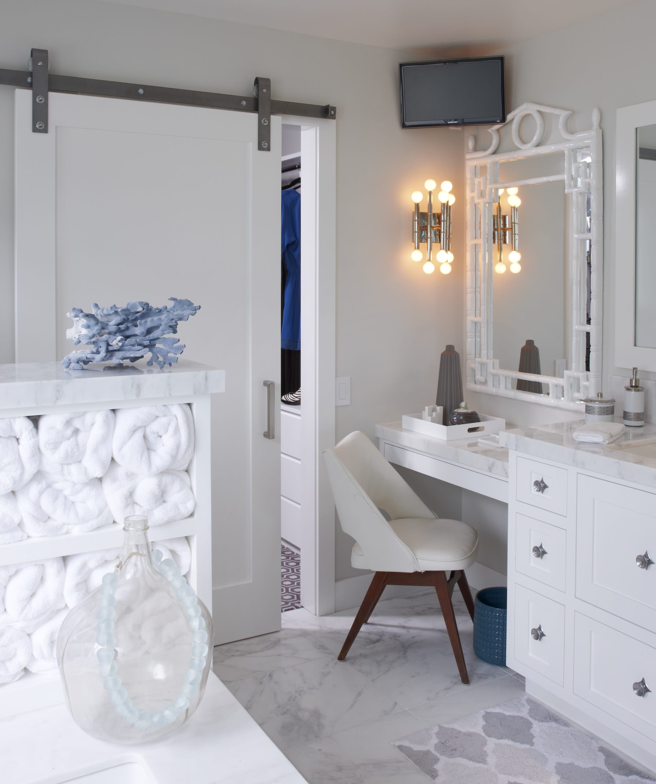 When combining a standing vanity with a sit-down makeup station, you’ll need to adjust the height down to about 28 inches or lower (minimum: About 24 inches).
