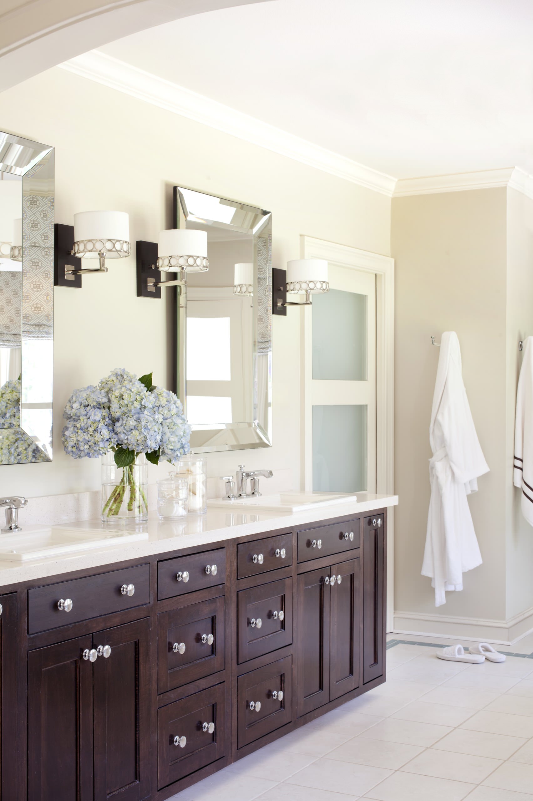 Likewise, the height of mirrors should be based on your own height. Find an average eye-line for everyone using the mirrors and make sure this height is well within the upper and lower borders of the mirror (5 ft., 6 inches is average, but your household may vary).