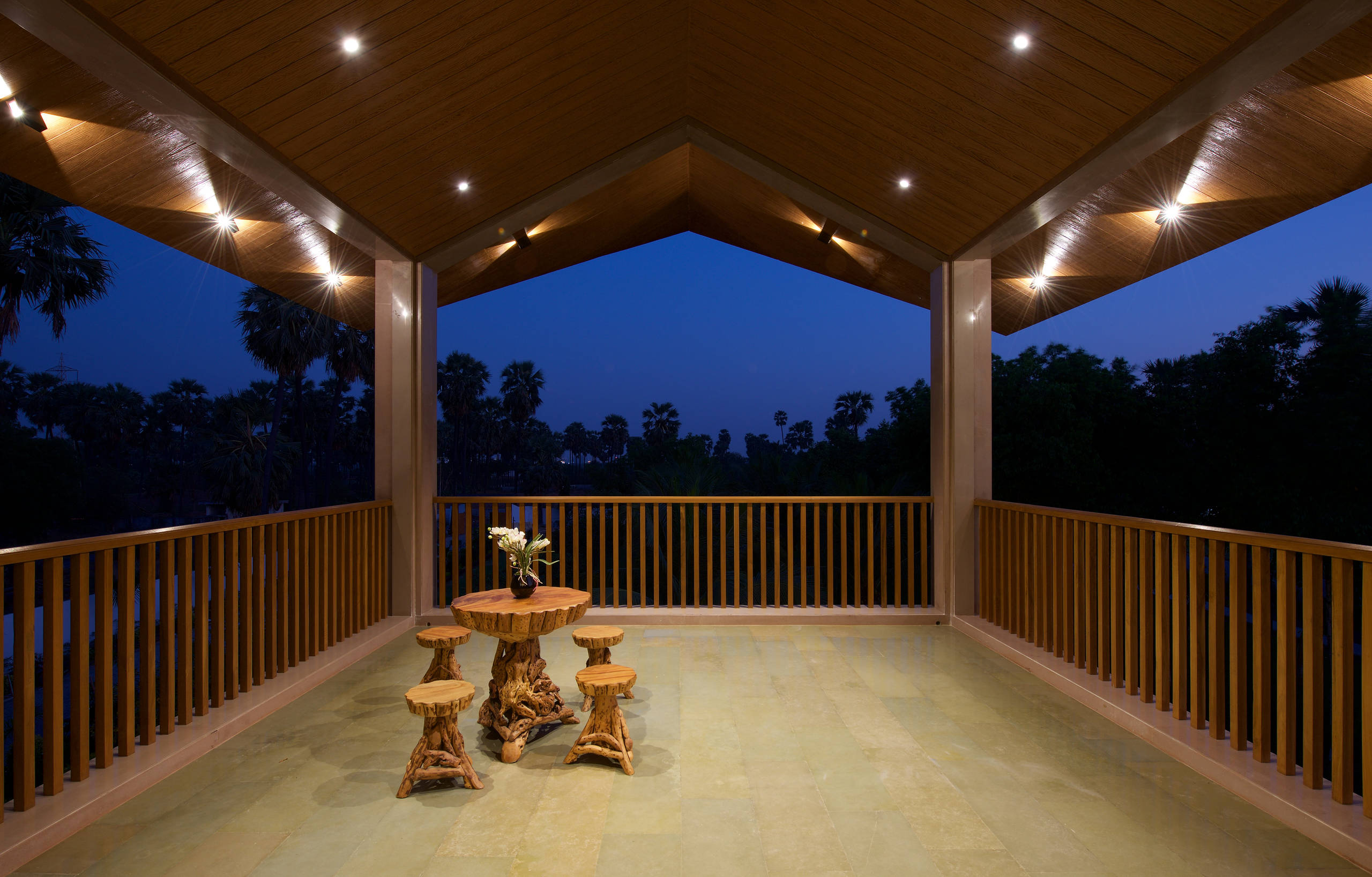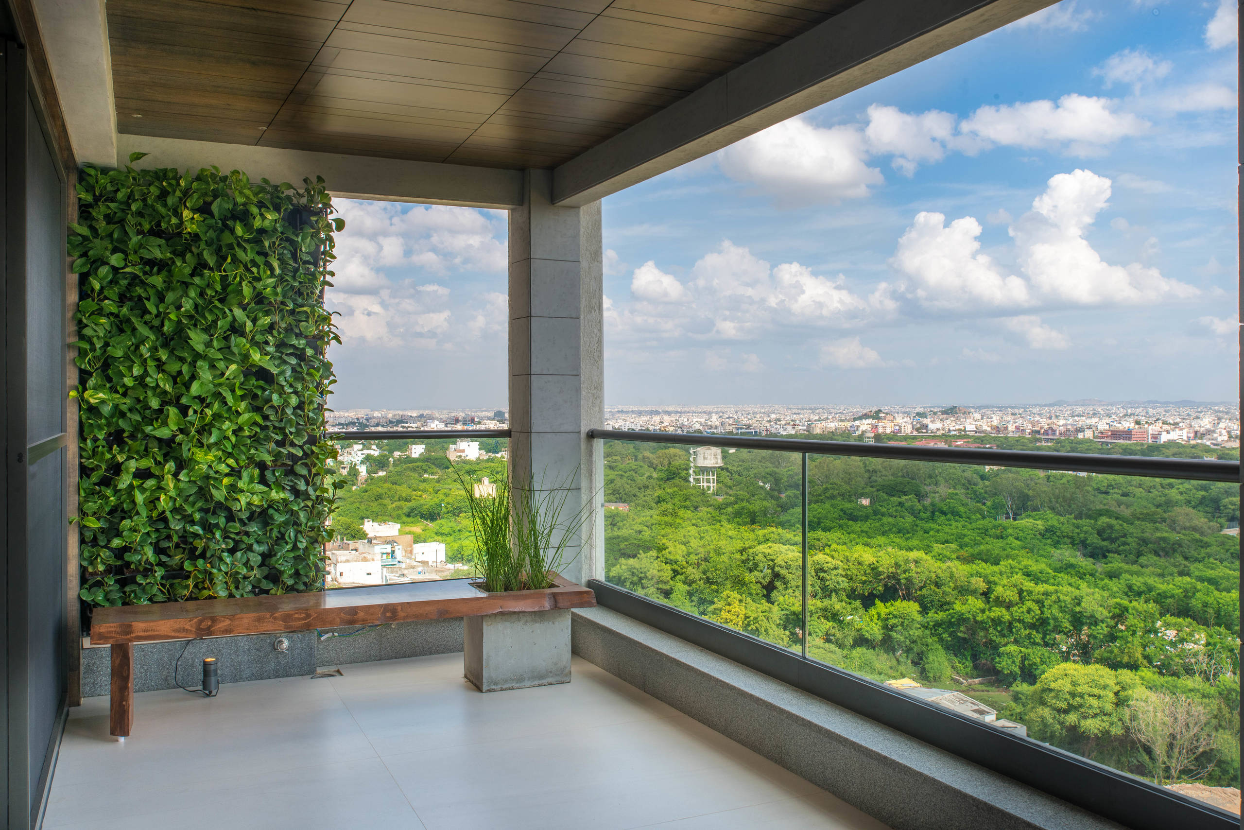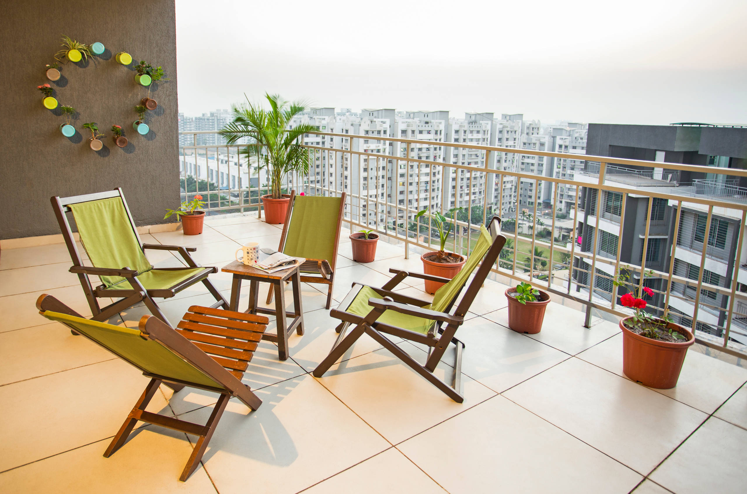 Wooden railings add softness and bring in an element of warmth into the balcony. But when it comes to safety, especially in high-rise buildings, it is strongly recommended to go for only metal railings because they are more sturdy. However, one could always combine wood as an infill panel within SS or MS railings.