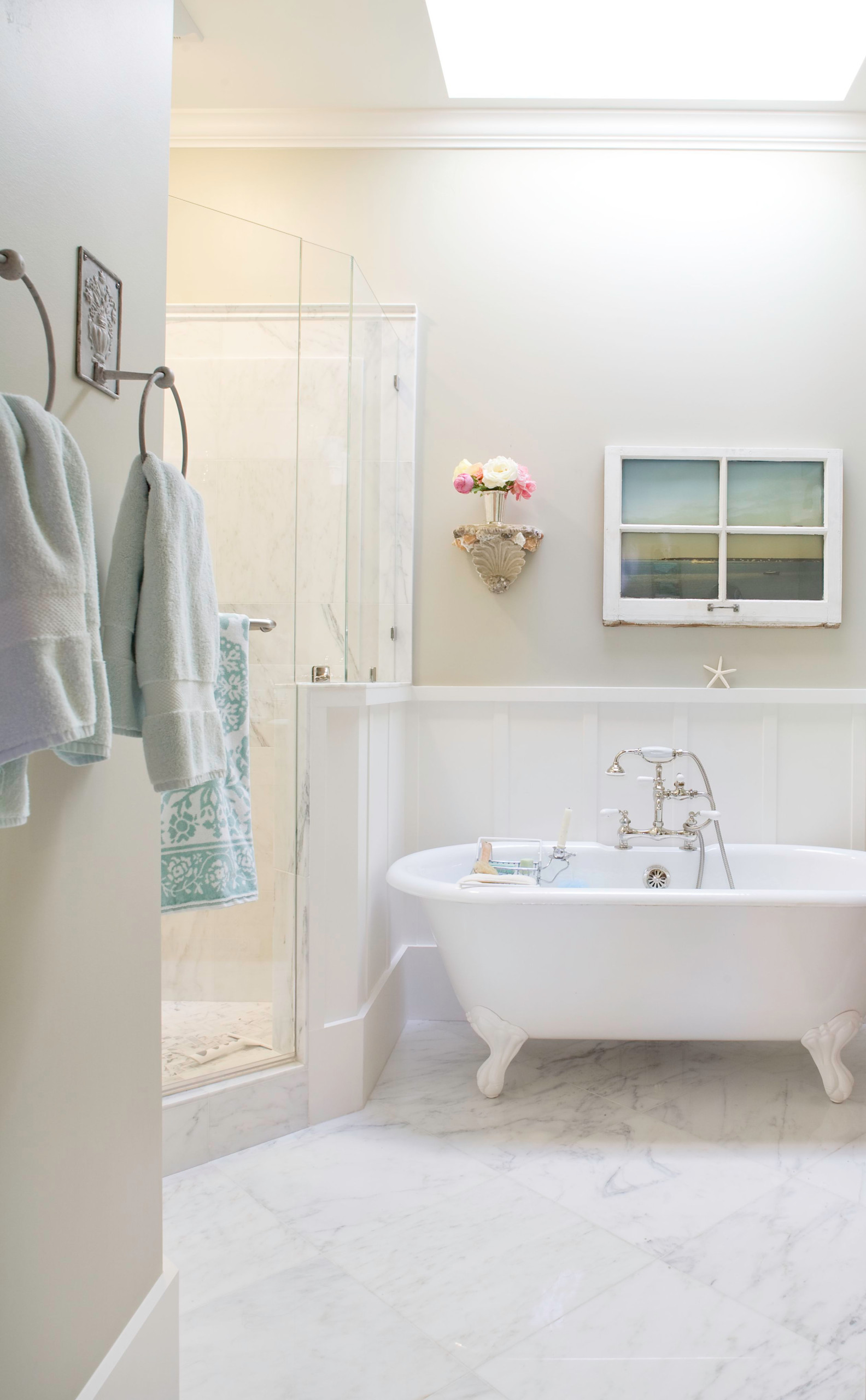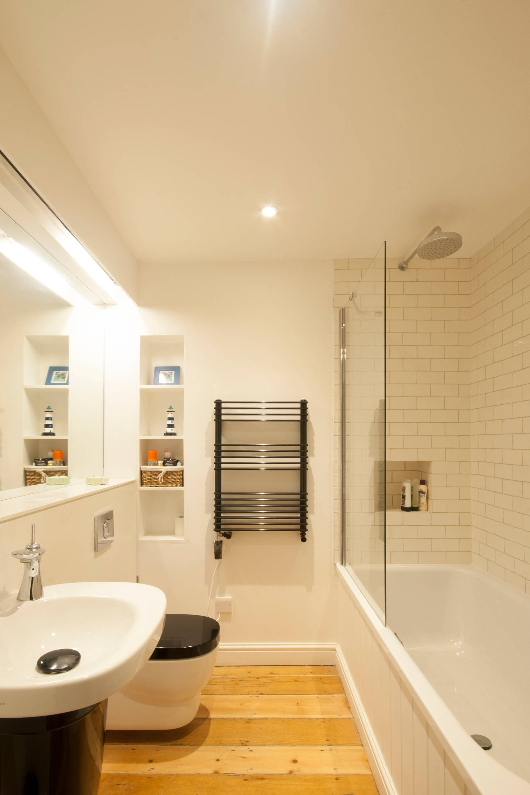 If you have the opportunity to install a roof light (you can just see a glimpse of the one in this room), then this could be the answer to your natural lighting issues. A wonderful overhead window fitted in the ceiling will flood your bathroom with light all day long and will also visually lift the ceiling, making the room appear more spacious. Why not have a little fun by creating a fake window like the owner of this bathroom has done. You could even change the view depending on the mood you want to capture… think relaxing beach scenes or soothing hills.