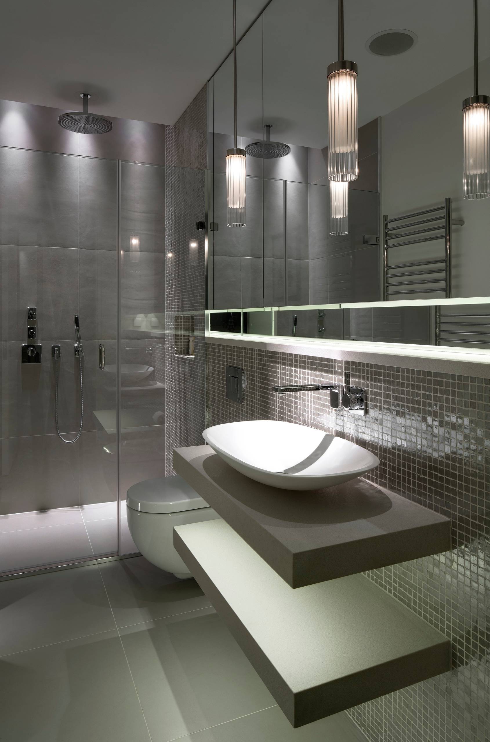 As well as plenty of reflective surfaces, getting your artificial lighting just right is essential as, let’s face it, this is the only illumination you have! Lighting up the mirror area with overhead spotlights is one good idea: It will create an atmospheric glow, as well as ensuring you have the ideal make-up or shaving station. Overhead spots will flood the space with light when required, and separate controls for different lighting zones mean you don’t need to go full-beam at all times.