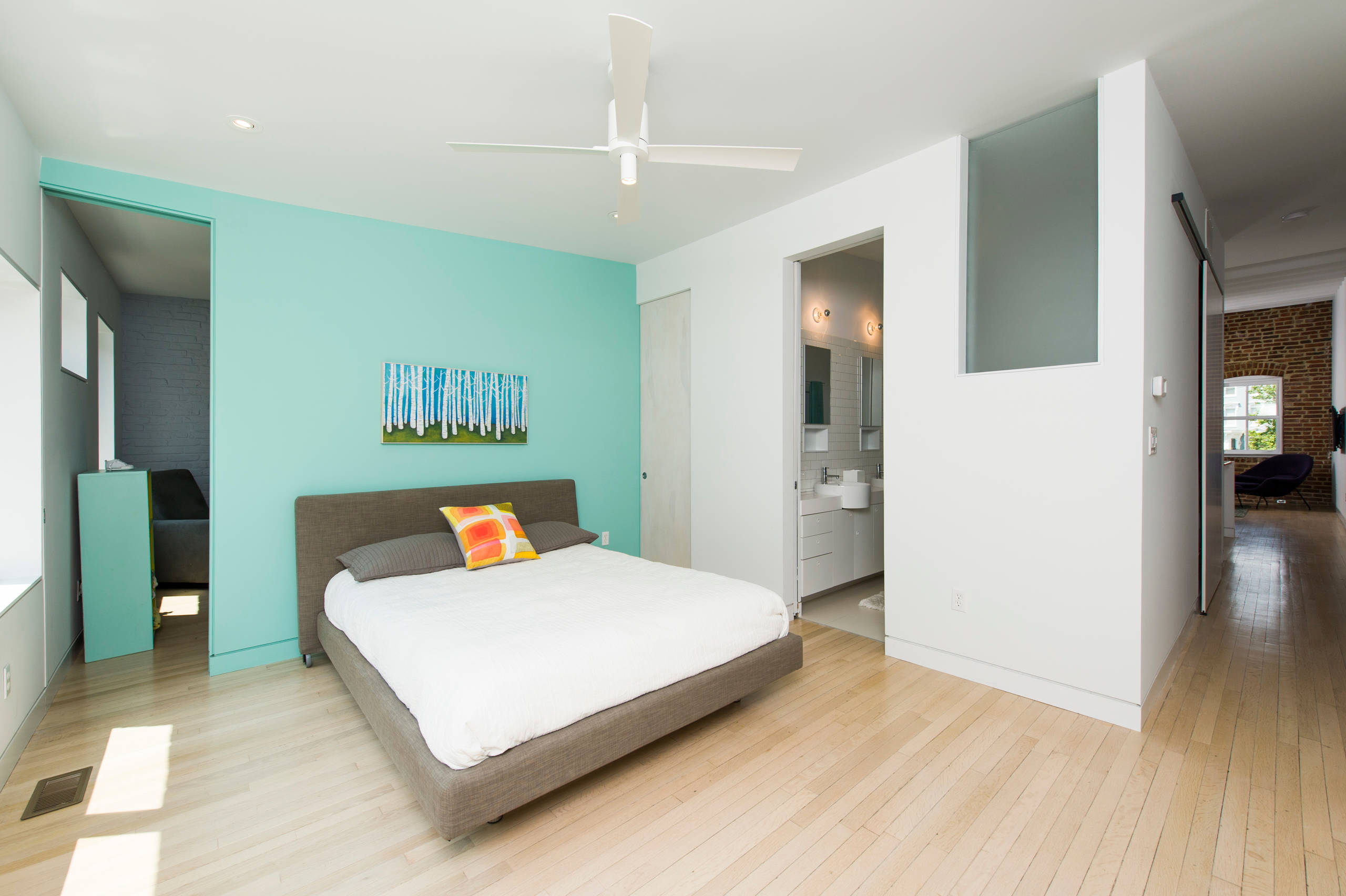 While white will always be a winner for a crisp, bright feel, there’s no need to avoid colour in a windowless room if that’s more your thing. Just choose your shade very carefully: Pick something that actively brightens rather than sucks in light or overwhelms; this multi-tonal turquoise scheme brings a richness and warmth, while still being luminous. Grey and white accents keep things crisp and classy.