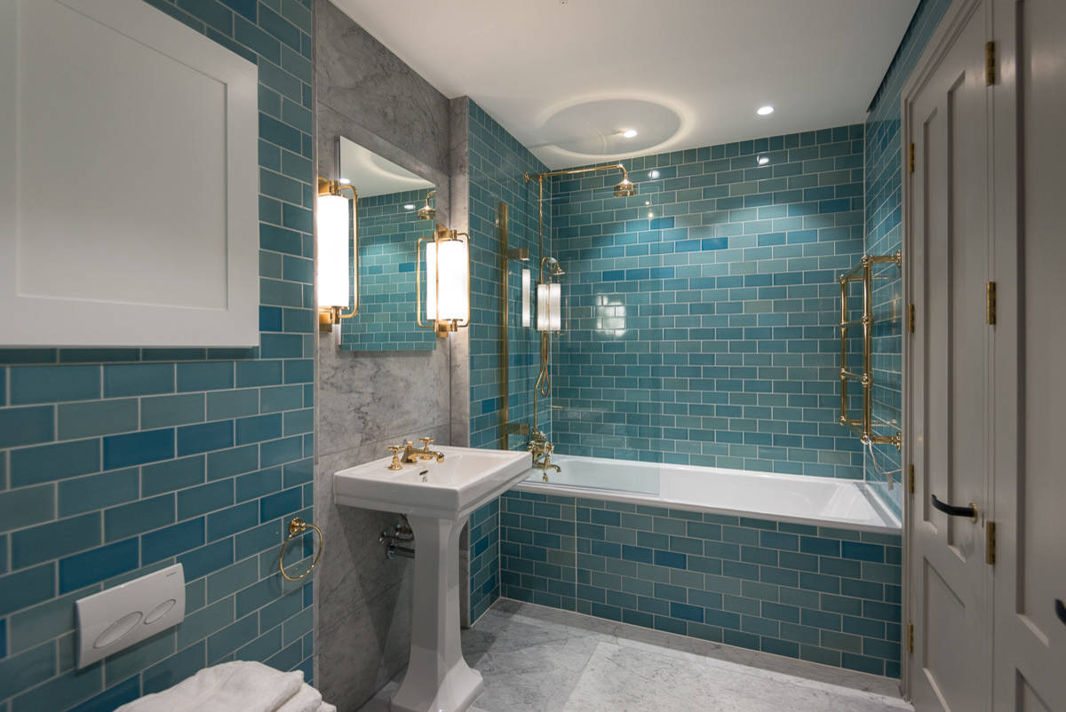 If you’re still keen on bringing in a sense of the outdoors, try installing a dramatic drop-ceiling with recessed lighting at the edges that mimics sunlight streaming in from above. The light is then directed down the walls and will highlight any interesting wall textures or tiles to make this the focus of the room. Here, brass details further hint at the idea of sunshine.