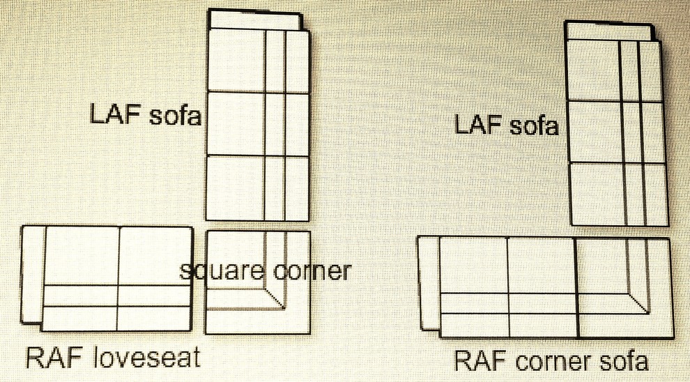 If you built that same sectional, still using the LAF sofa but using a RAF corner sofa rather than the RAF love seat and the one seat corner, you would have used two pieces, not three, and would have saved some major bucks. The corner sofa has a back that forms the corner and saves your having to purchase an additional corner piece.