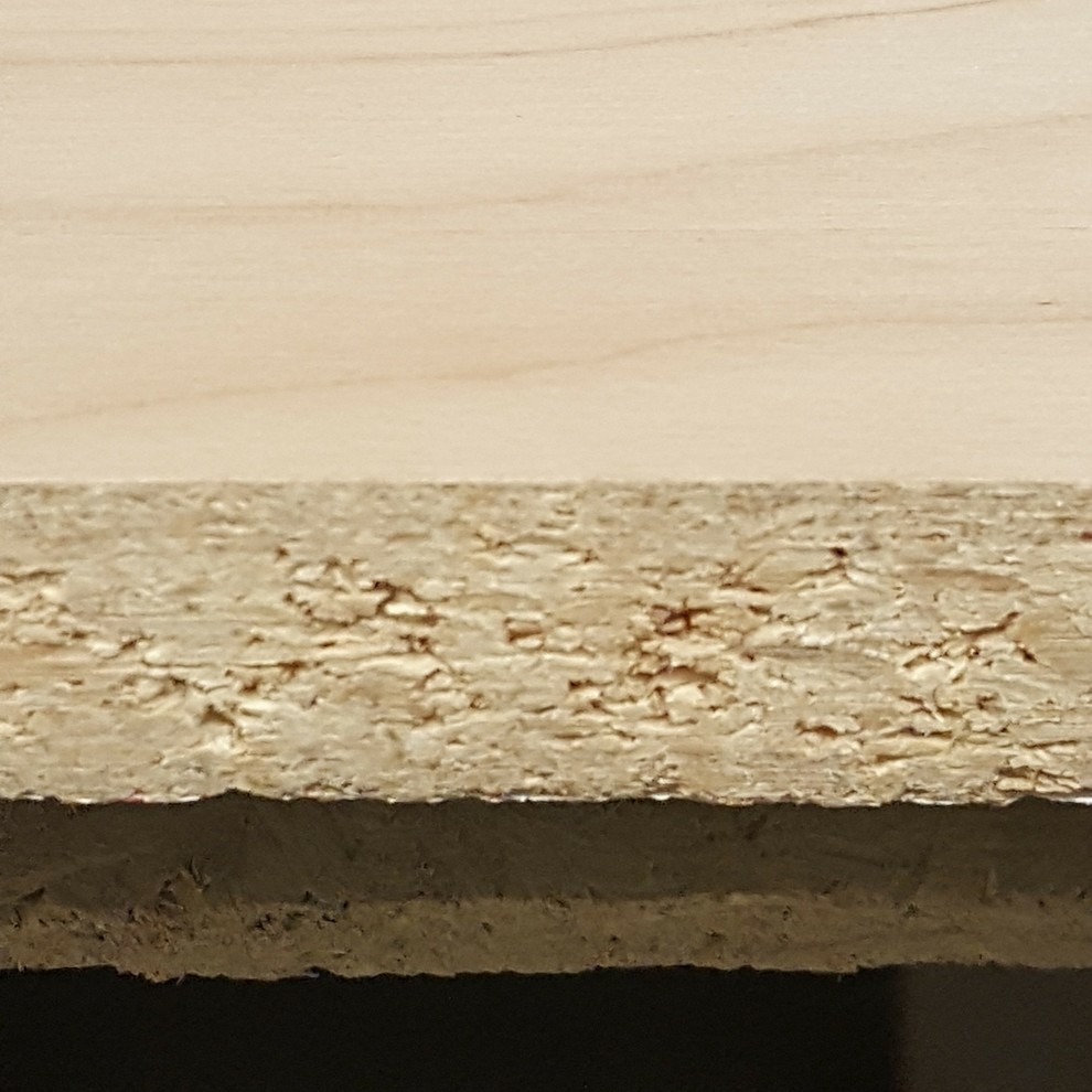 Made similarly to MDF, particle board uses larger wood scraps to create boards. You can differentiate particle board from MDF by spotting the pockets of air when looking at it from the side.