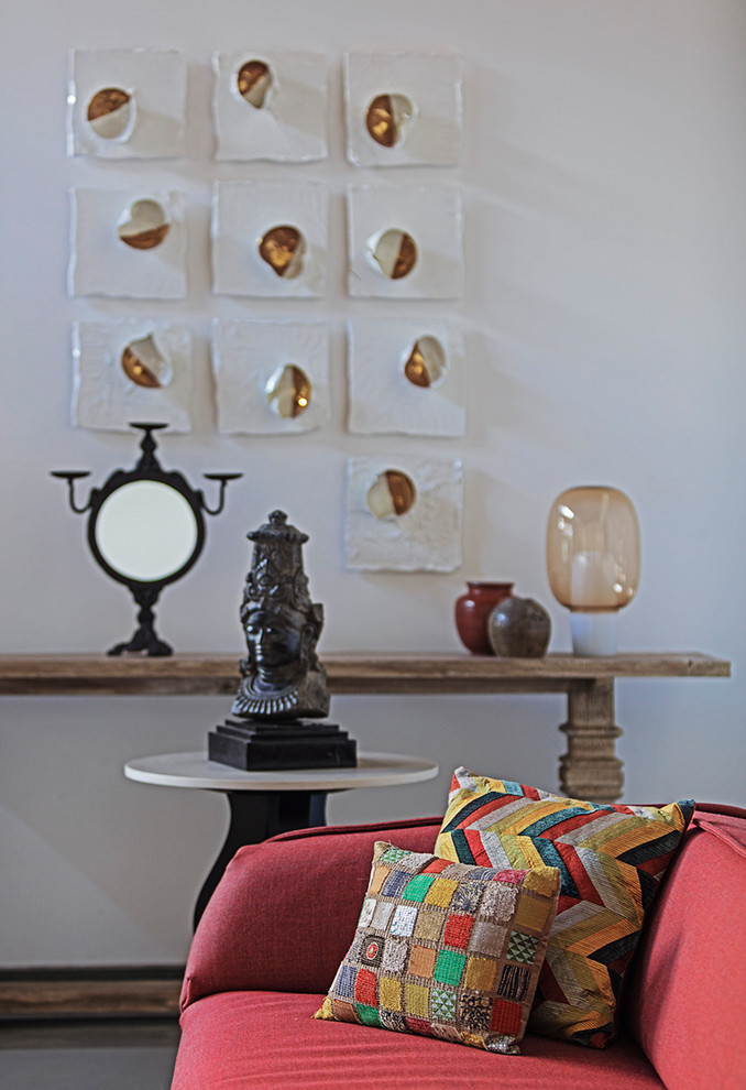 10. In In this space designed by Khosla Associates, the black Lord Shiva bust and the solid red sofa are beautifully...